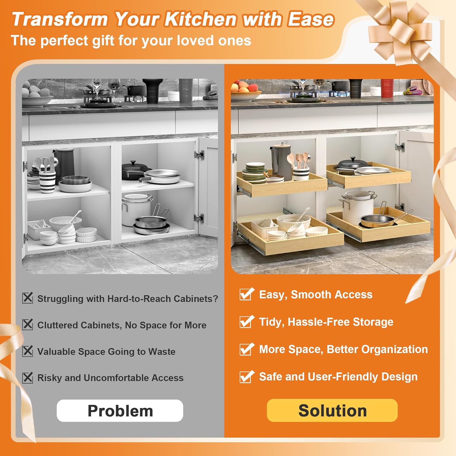- Soft-Close & Heavy-Duty Slides: These cabinet pull out shelves feature full-extension soft-close slides for smooth, quiet performance. Designed for everyday convenience, the pull out cabinet drawer makes it easy to access hard-to-reach items, helping you stay organized and maximize your storage space