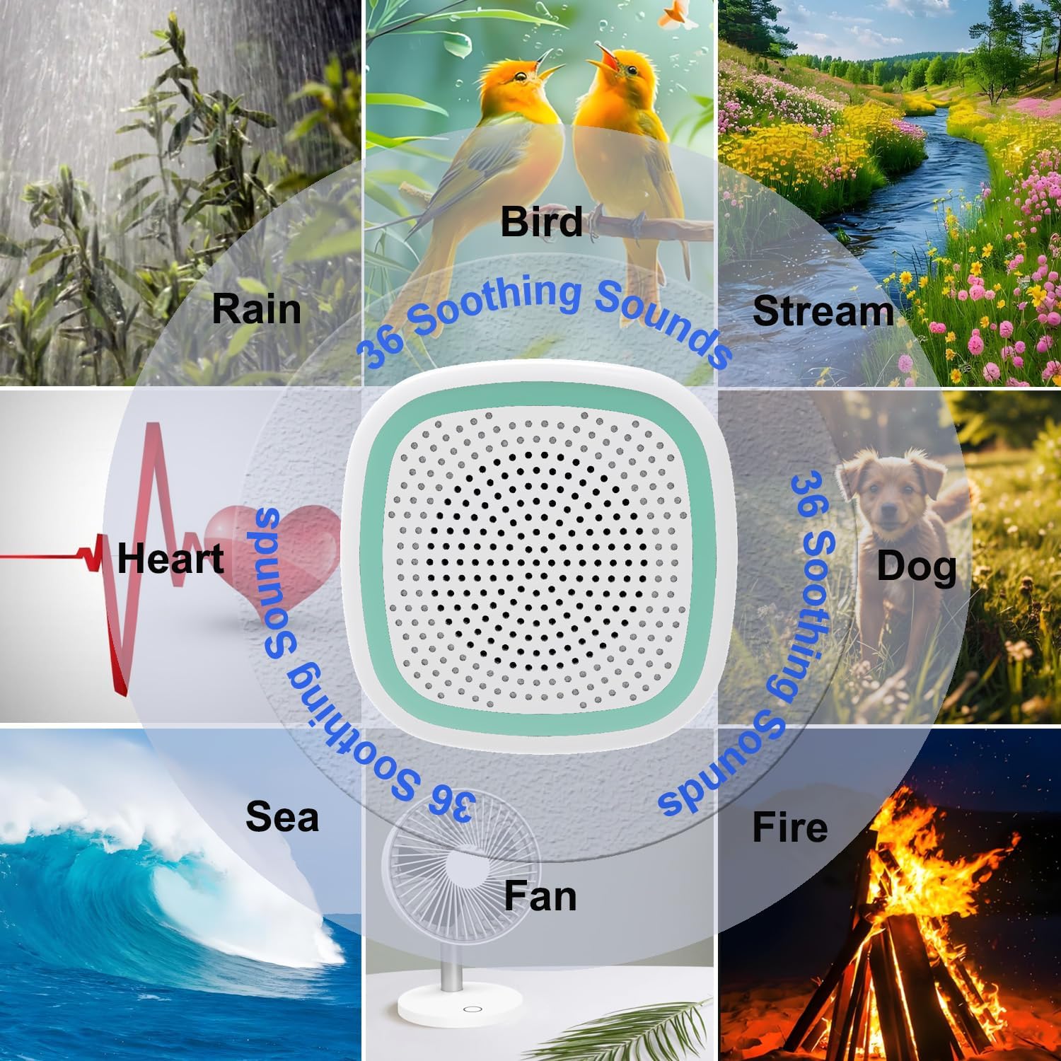 - 【36 Chimes】: Under The White Noise Mode,the Machine built-in 36 digitally recorded sounds,they are Including white noise and simulating natural environment sound,relaxing chimes and help people to get good-quality sleep. Including white noise, heartbeat wind, rain, creek, and other ringing tones,and so on.