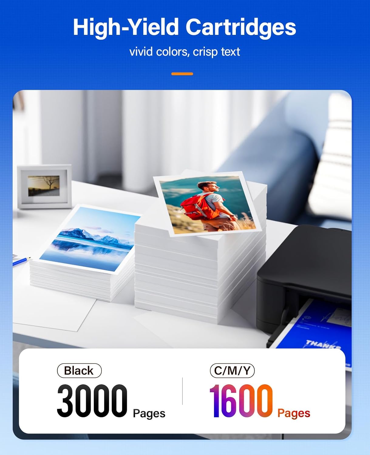 - 【Page Yield】Up to Black is 3,000 pages per black Ink cartridge and Color is 1,600 Pages per color Ink cartridge (Letter/A4, at 5% Coverage).