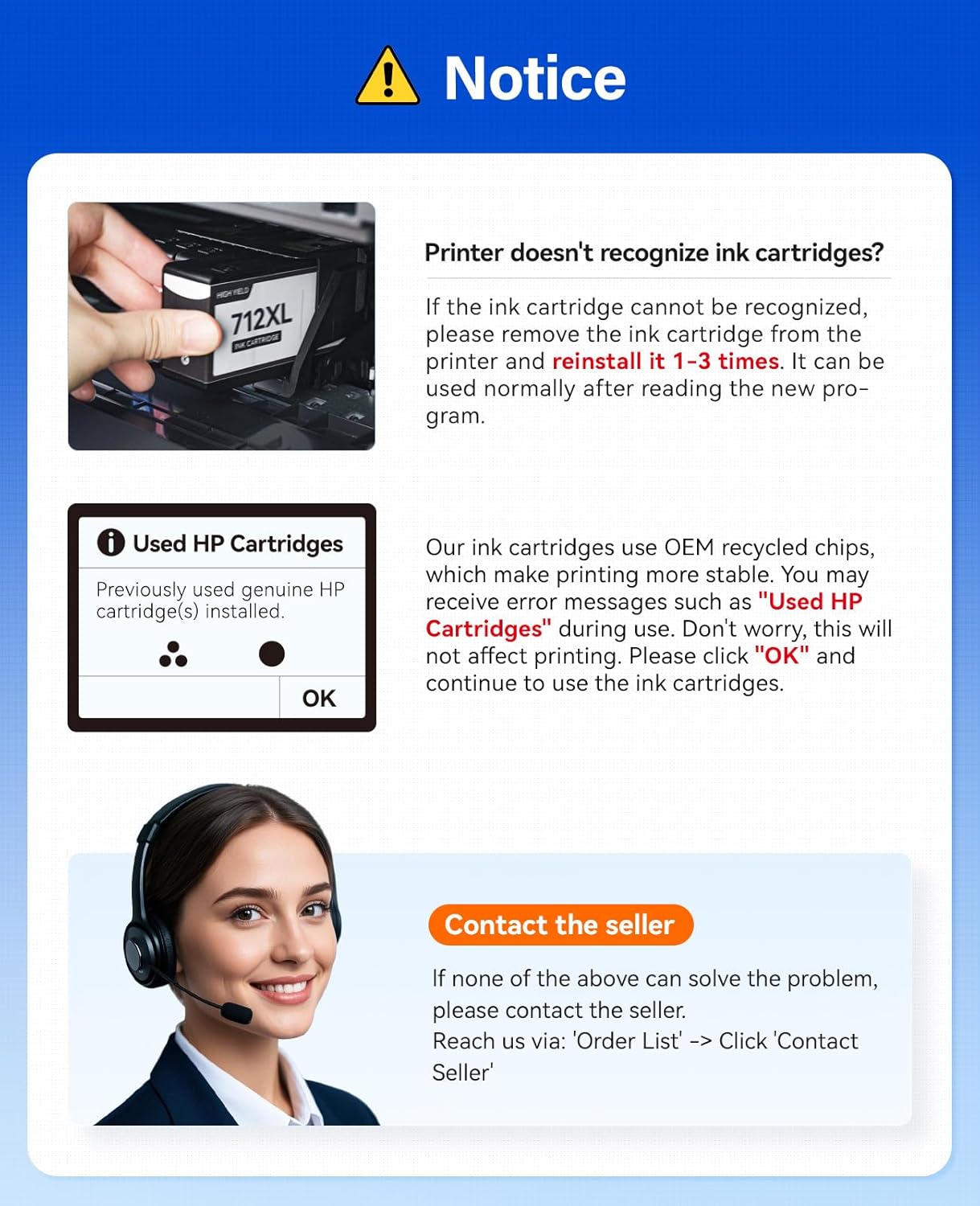- 【Warm Tip:】Please check the printer model of this Ink Cartridge for 712 712XL Ink Cartridges and make sure your printer model before placing an order.