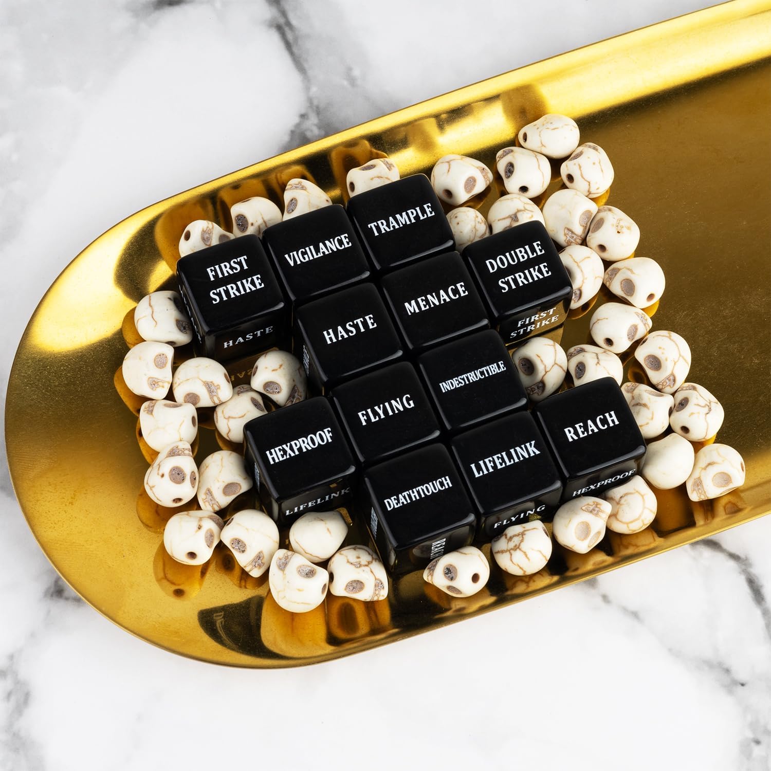 - Package Include: Total 24pcs black MTG keywords dice(FIRST STRIKE,DOUBLE STRIKE VIGILANCE,MENACE,TRAMPLE,HASTE / LIFELINK,REACH,FLYING,HEXPROOF,DEATHTOUCH,INDESTRUCTIBLE) and 24pcs dice counters(12 pieces blue -1~-6 counters & 12 pieces purple +1~+6 counters) with velvet pouch.