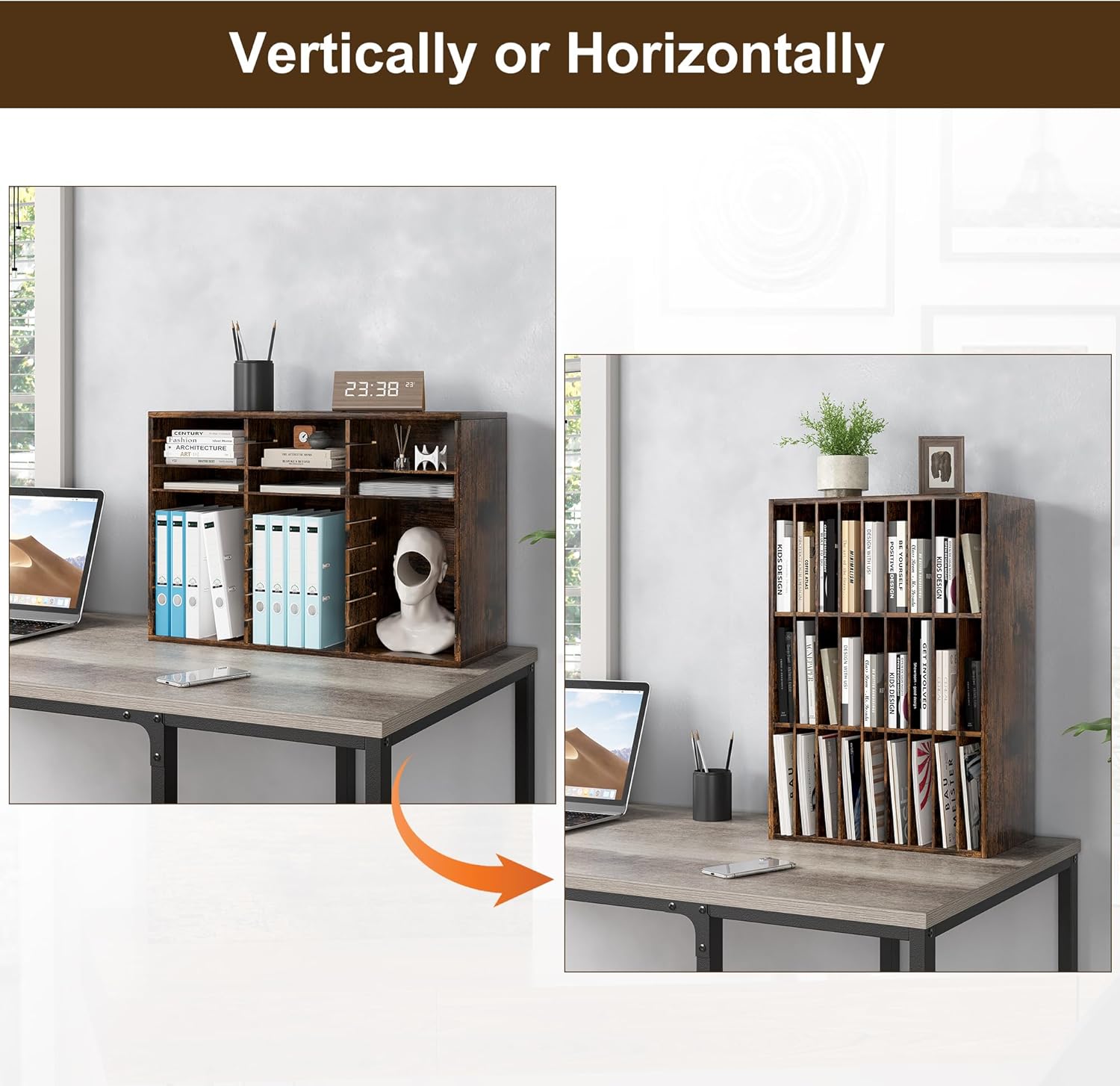 Mail Organizer Countertop, 27 Slots Wooden Desk File Literature Sorter, Adjustable Paper Storage Shelves Document Holder, Space Saving Desktop Mailbox for Office Classroom, Rustic Brown