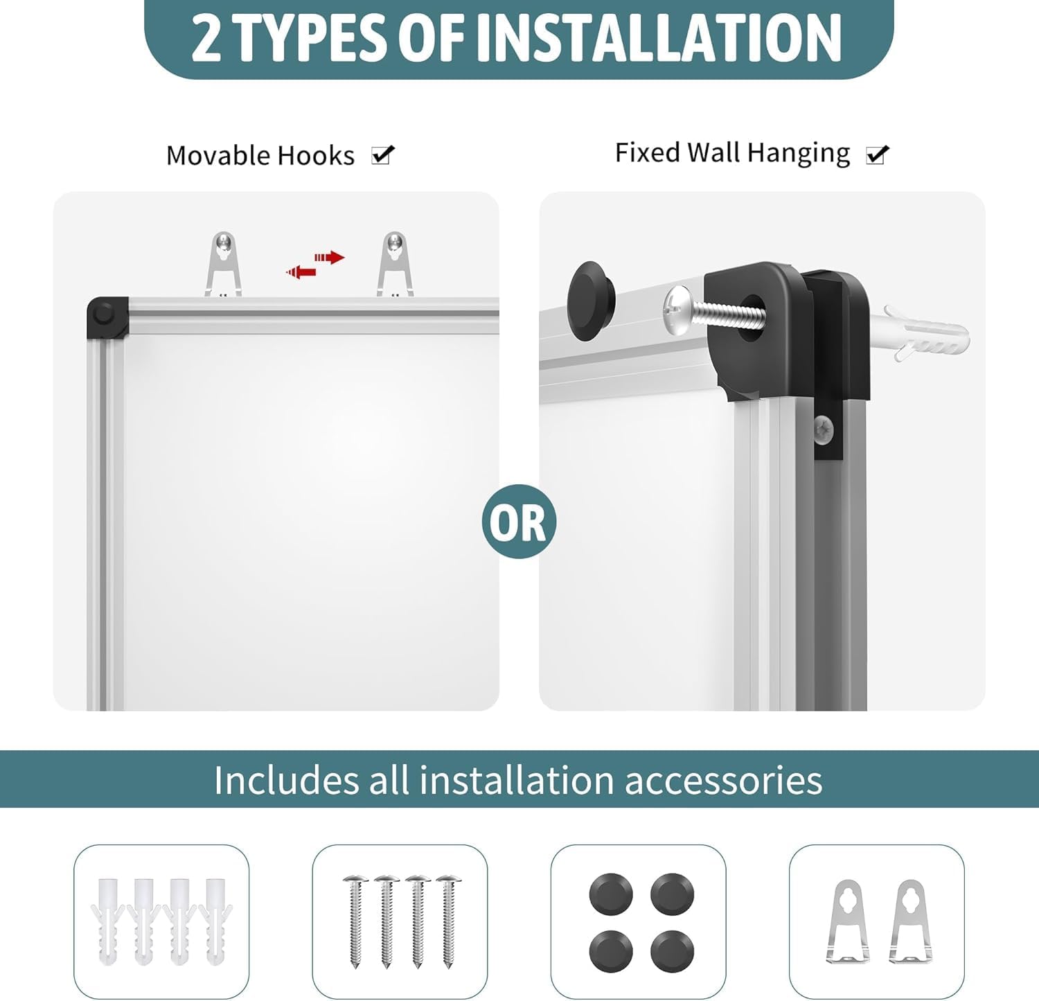 - Easy to Install: Mounted vertically or horizontally just as you like, the detachable free marker tray can be placed on any of the board's 4 sides