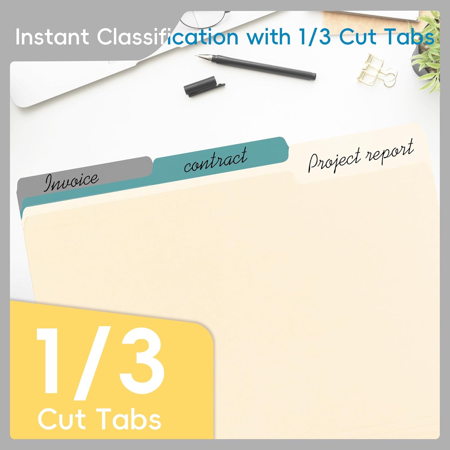 - 1/3 Cut Tabs: These manila file folders have 1/3 cut tabs in assorted positions,providing ample space for labeling and quick identification of paper contents.