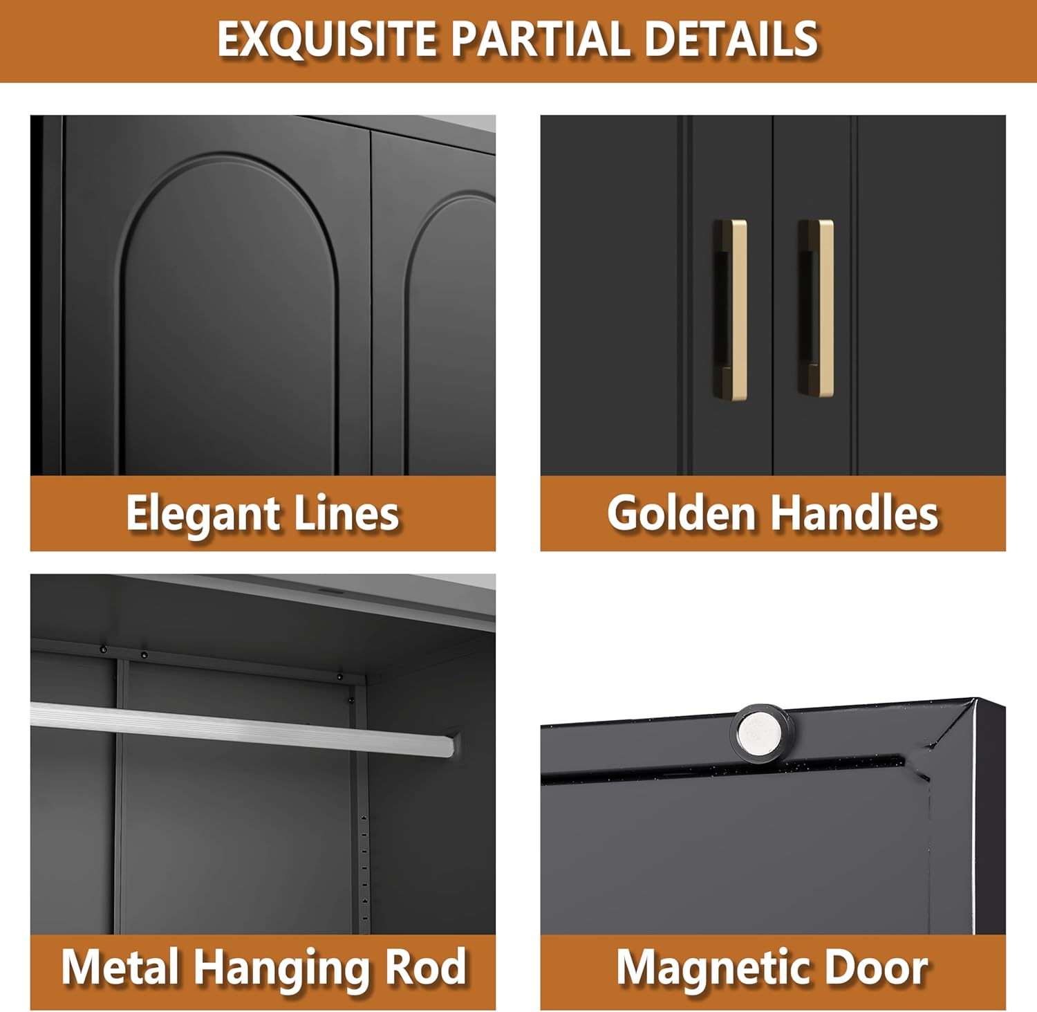- [PRACTICAL DETAILS] This metal wardrobe closet incorporates several ingenious features. Anti-tip devices keep it securely in place, preventing accidents. Adjustable feet allow it keep to level on uneven floors. Additionally, the built-in magnetic doors ensure close automatically, adding convenience to your daily use