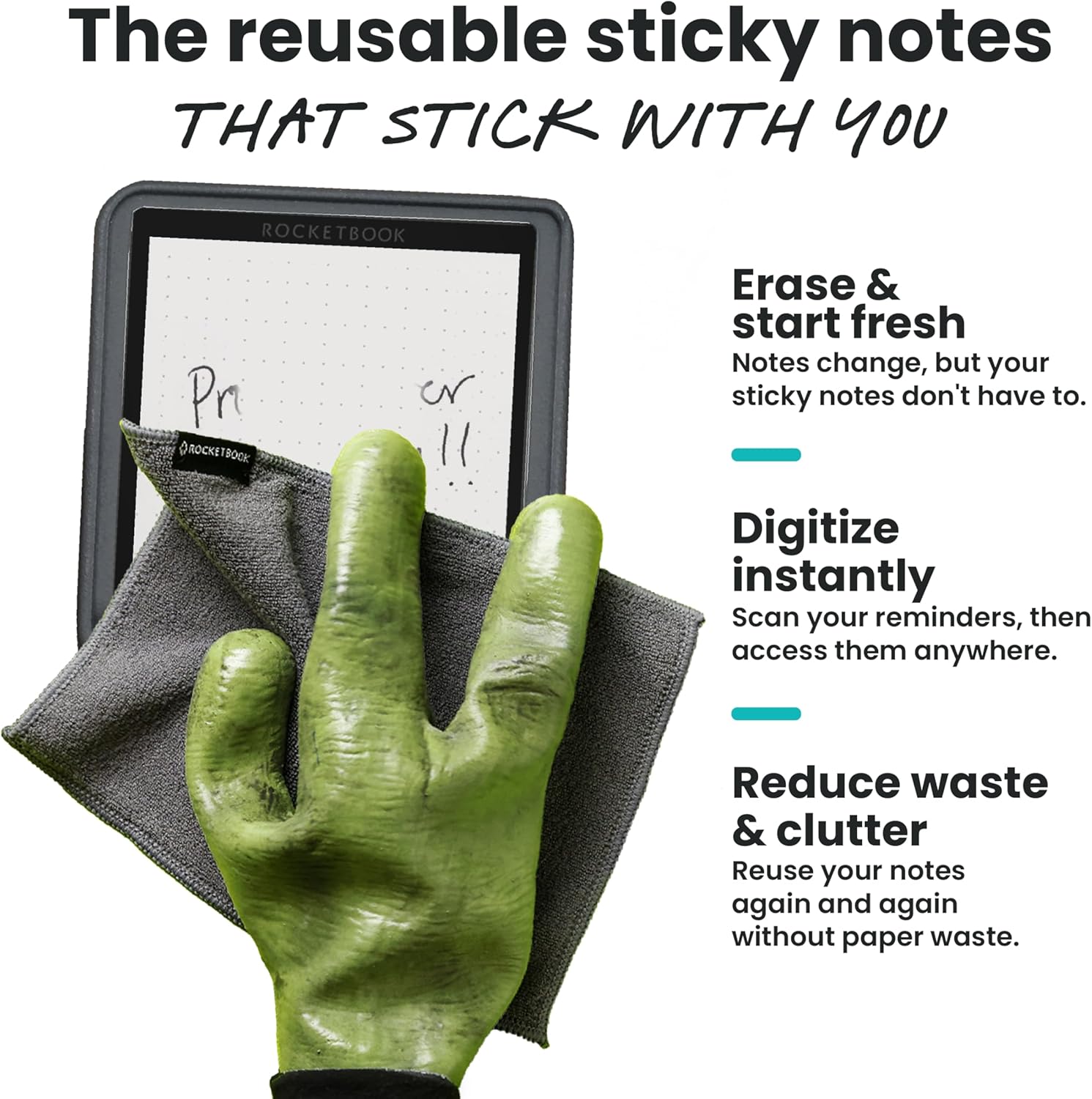 - Reusable and Clutter-Free: Reduce waste and keep your space tidy with restickable sticky notes that offer a paper-like experience. They stick securely to many surfaces, like monitors, whiteboards, desks, and even your Rocketbook notebook.
