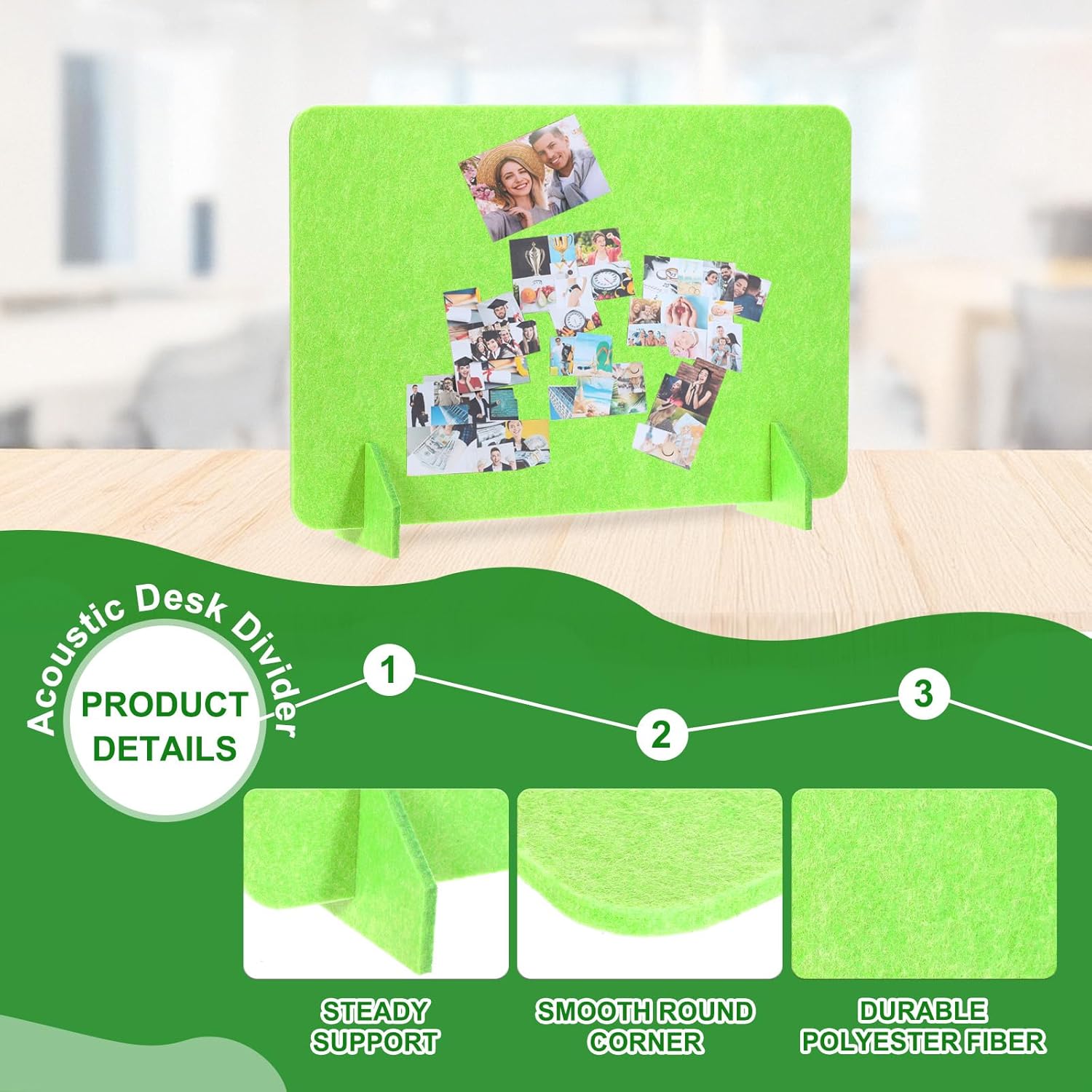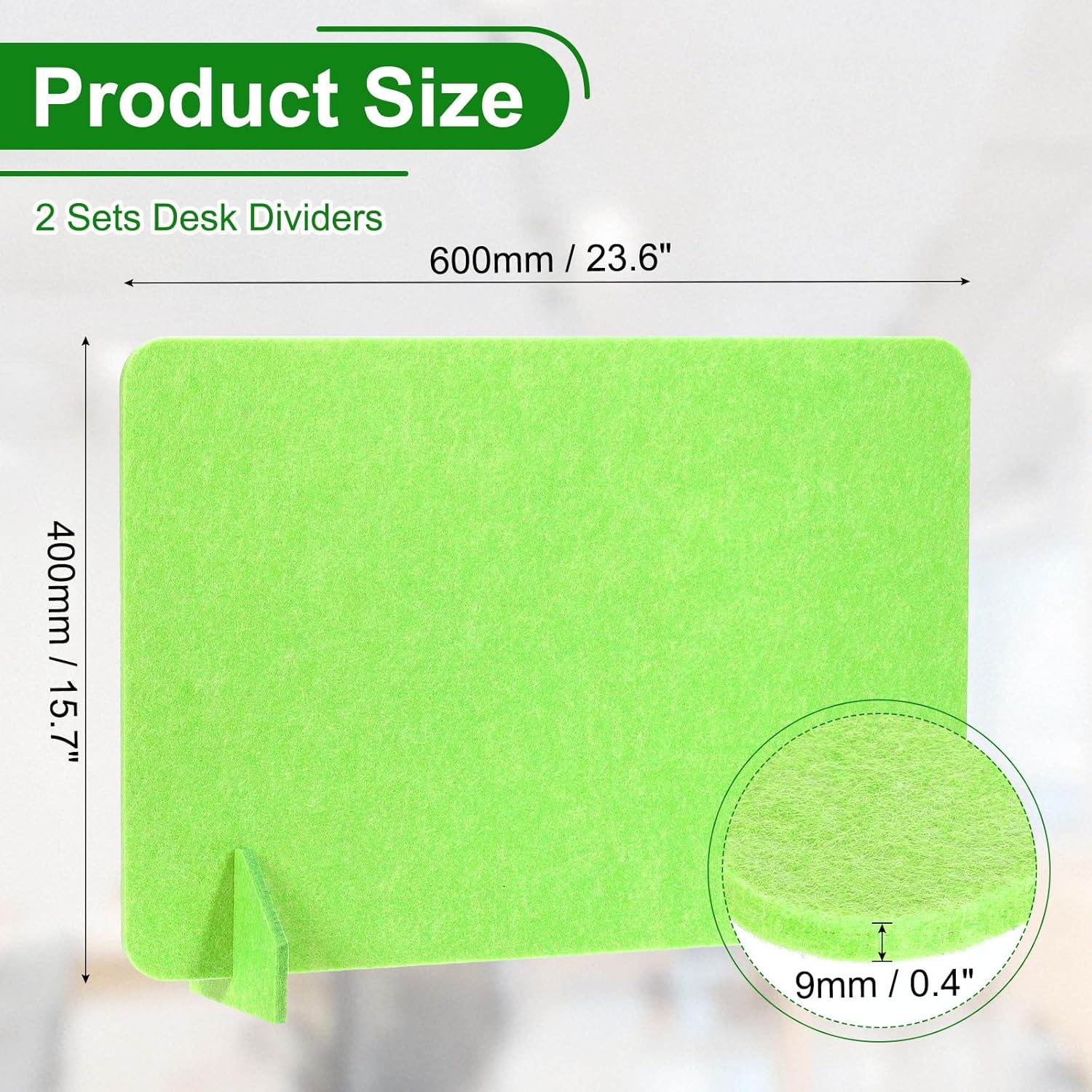- Specification: Material: Polyester Fiber; Size: 600 x 400 mm/23.6 x 15.7 Inch(L*W); Thickness: 9mm/0.4 Inch; Color: Green; Packing List: 2 Sets x Desk Dividers(Each Set includes 1 Pcs x Divider and 2 Pcs x support feet)