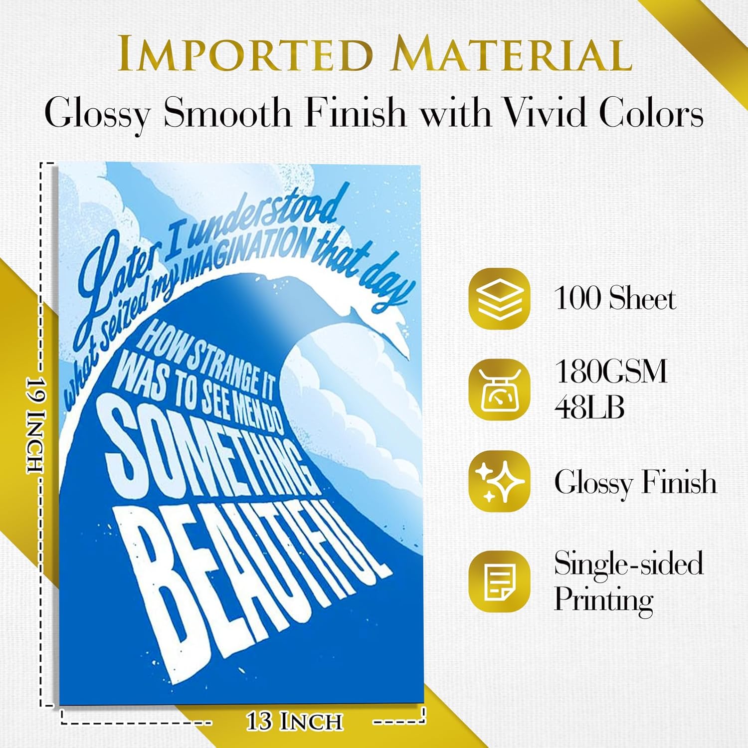- Photo Paper Package: 100 sheets of glossy photo paper, 13Γ19 inch, 180gsm/48lb paper, single-sided printing and blank back side for recording or writing.