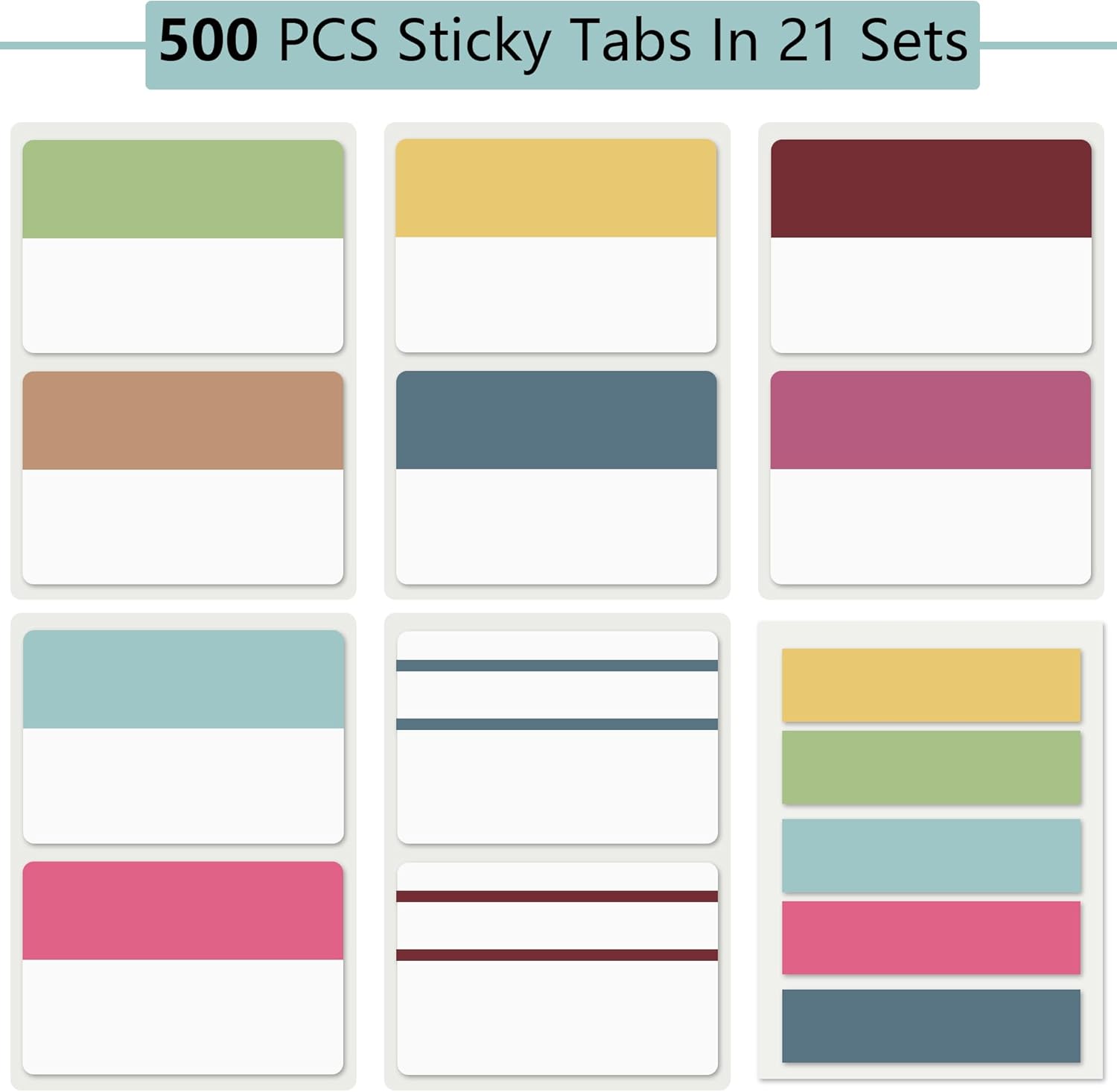 - 500 pieces Tabs: 500 pieces 21 sets in total, 400 pieces 2 inch sticky tabs in 20 sets with different pastle colors,100 pieces 0.5 in tabs in 1sets, 20 pieces each color