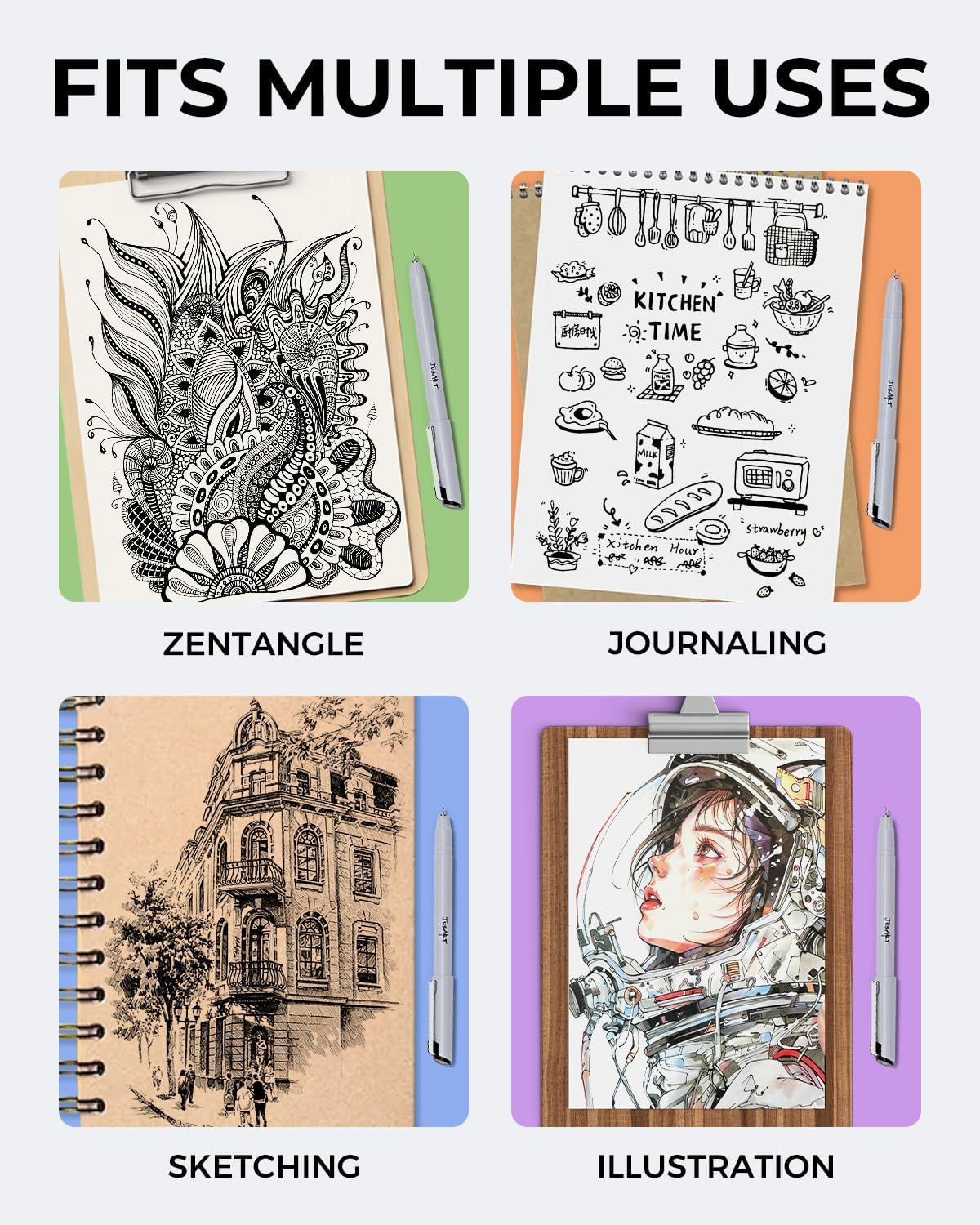 JusArt Fineliner Pens, Ultra Fine, Fine, Brush & Chisel, 12 Size, Waterproof Black Pigment Pen for Artists, Crafters, Illustration, Sketching, Writing, Journaling, Bible Note, Technical Drawing pens