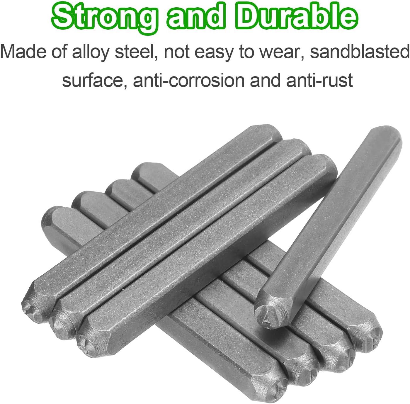 - Size - Letters: 4x4mm / 0.16x0.16 inch (LxW); Steel bars: 60x6x6mmmm / 2.4x0.24x0.24 inch (LxWxH); Package includes: 36 x metal punch stamps (26 uppercase letters from A to Z, numbers from 0 to 8, an '&' symbol, the "6" stamp can be used as a "9")