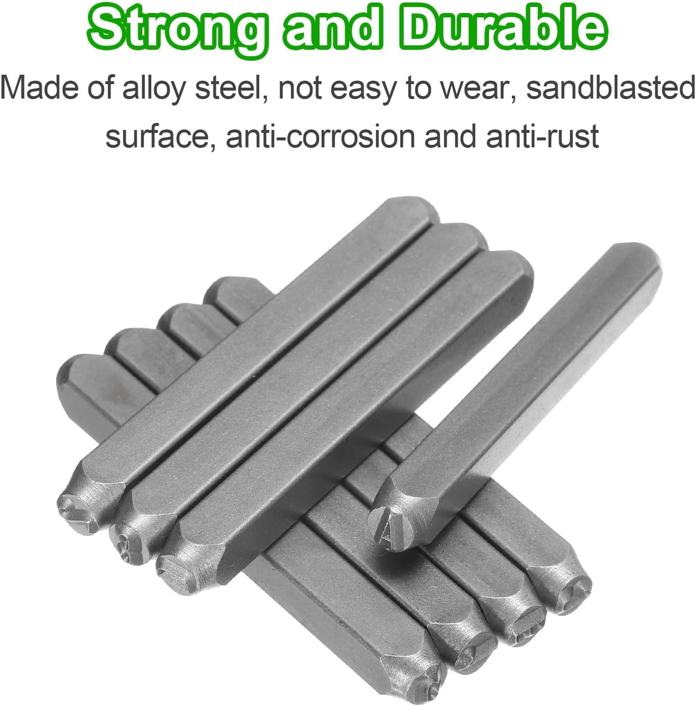 - Size - Letters: 5x5mm / 0.2x0.2 inch (LxW); Steel bars: 63x8x8mmmm / 2.5x0.32x0.32 inch (LxWxH); Package includes: 36 x metal punch stamps (26 uppercase letters from A to Z, numbers from 0 to 8, an '&' symbol, the "6" stamp can be used as a "9")