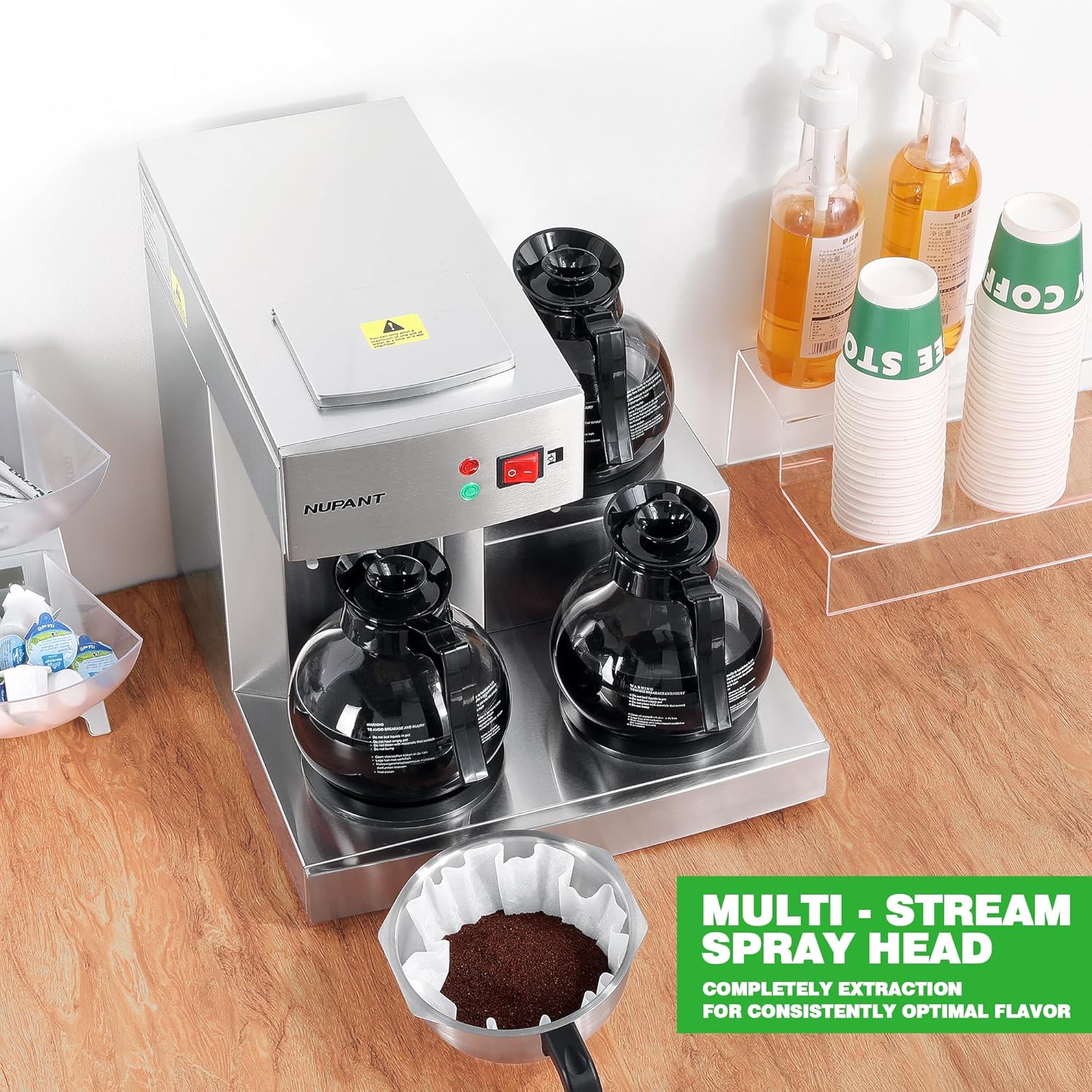 - [EFFICIENT COMMERCIAL COFFEE POTS]: The industrial coffee maker brews 12 cups in 6 minutes, features 3 warming plates that keep 36 cups of coffee hot and ready to serve. You can have three pots rolling at one time and Easily handle foot traffic during the busiest times with this 3 burners commercial coffee machine