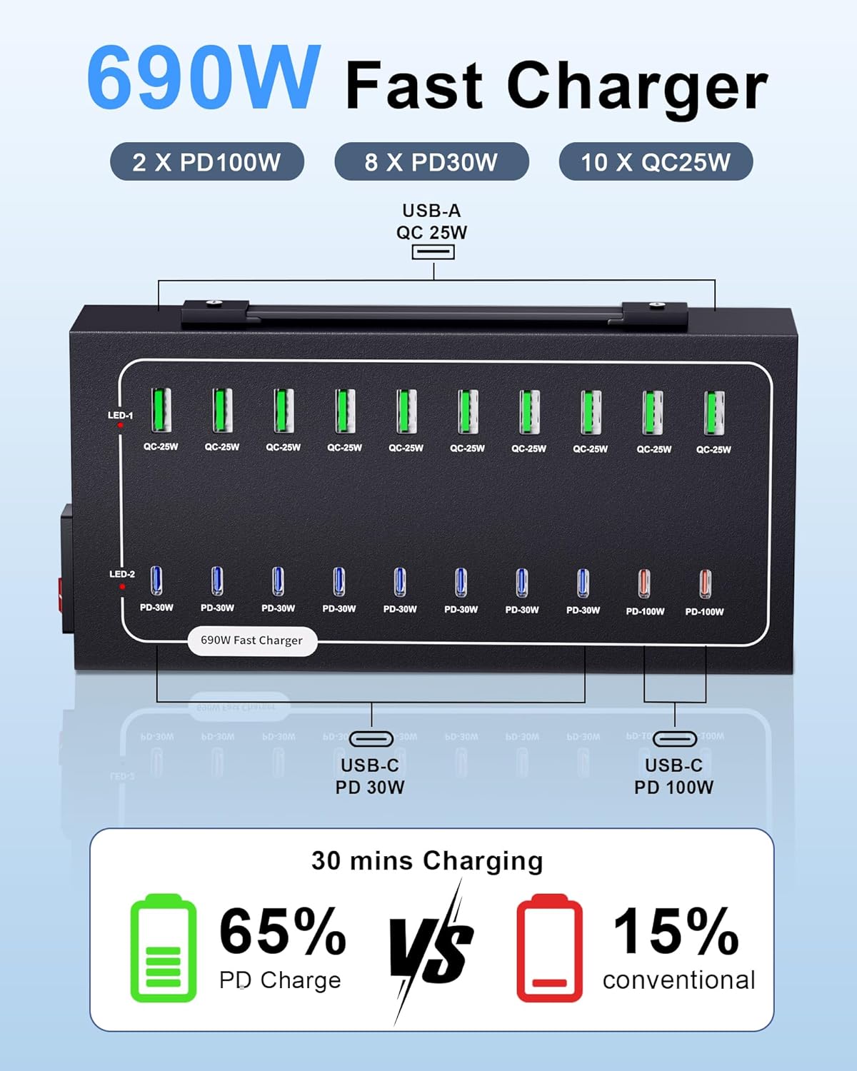 690W USB Charging Station, 20 Port Fast Charging Station for Multiple Devices, PD 100W USB C Charger Block, Smart Power Delivery & Multi Protection for Laptop MacBook iPhone, iPad, Tablet, and More