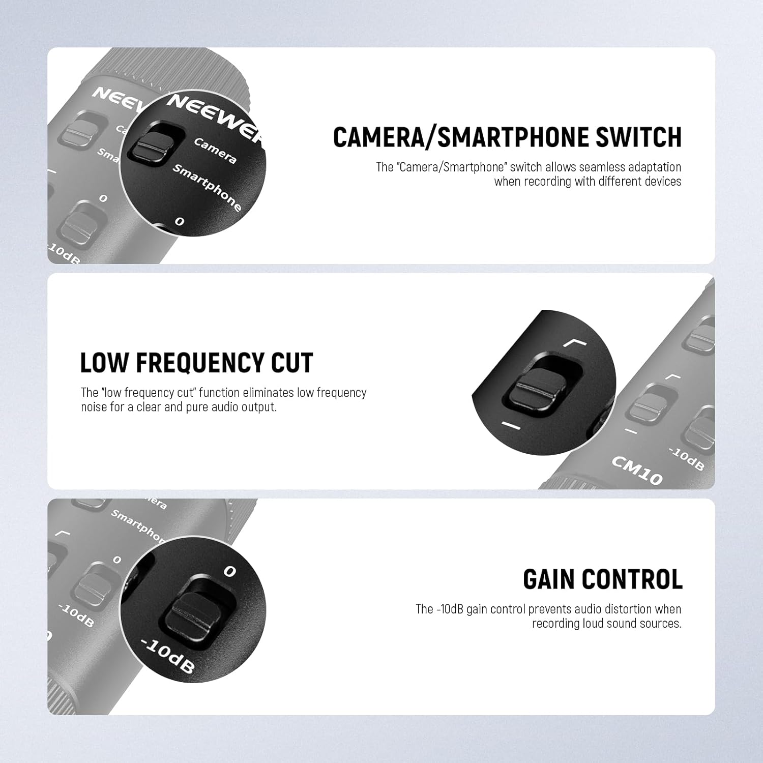 - 【Low Frequency Cut & Gain Control】 The "low frequency cut" function eliminates low frequency noise for a clear and pure audio output. And the -10dB gain control prevents audio distortion when recording loud sound sources