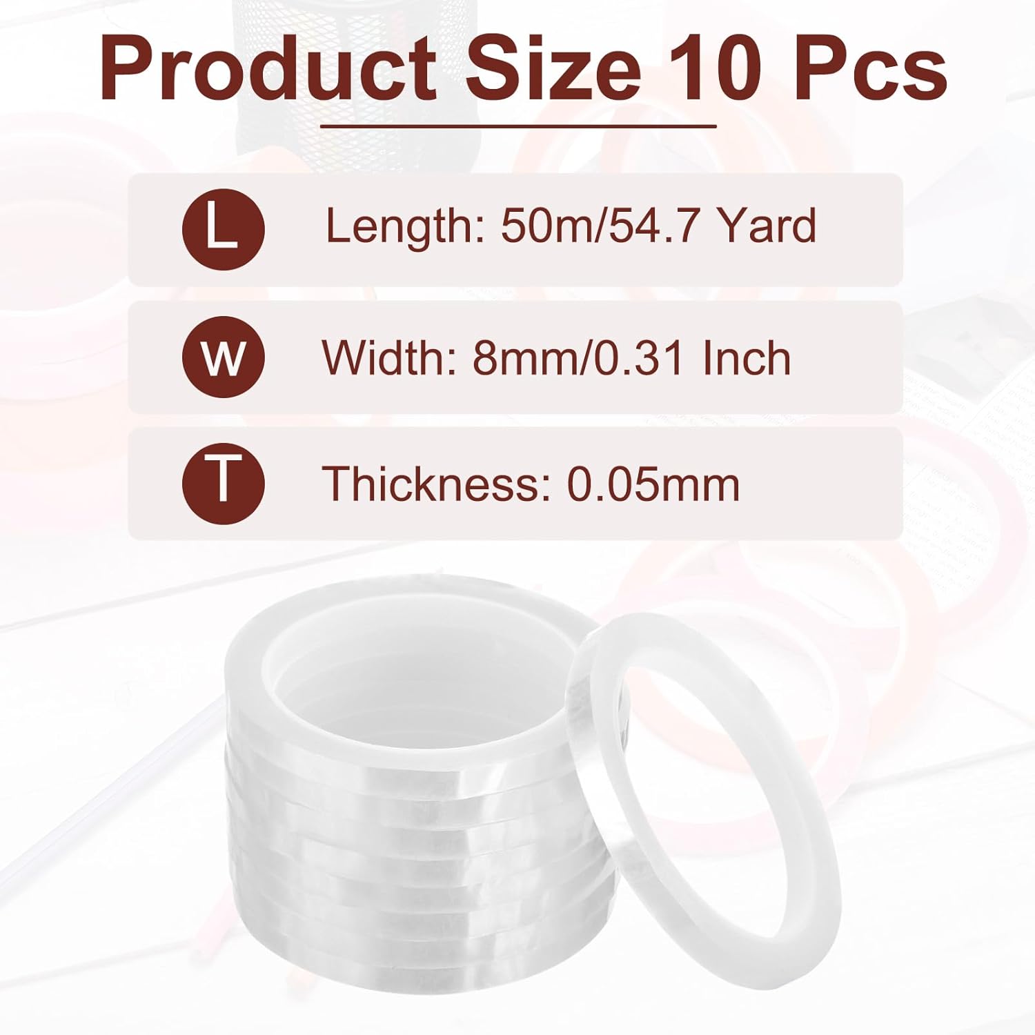 - This Art Tape is in size of: Length: 50m/54.7 Yard; Width: 8mm/0.31 Inch; Thickness: 0.05mm; Material: PET; Color: Clear; Temperature Resistance: 100Β°C; In the Package of: 10 x Whiteboard tapes
