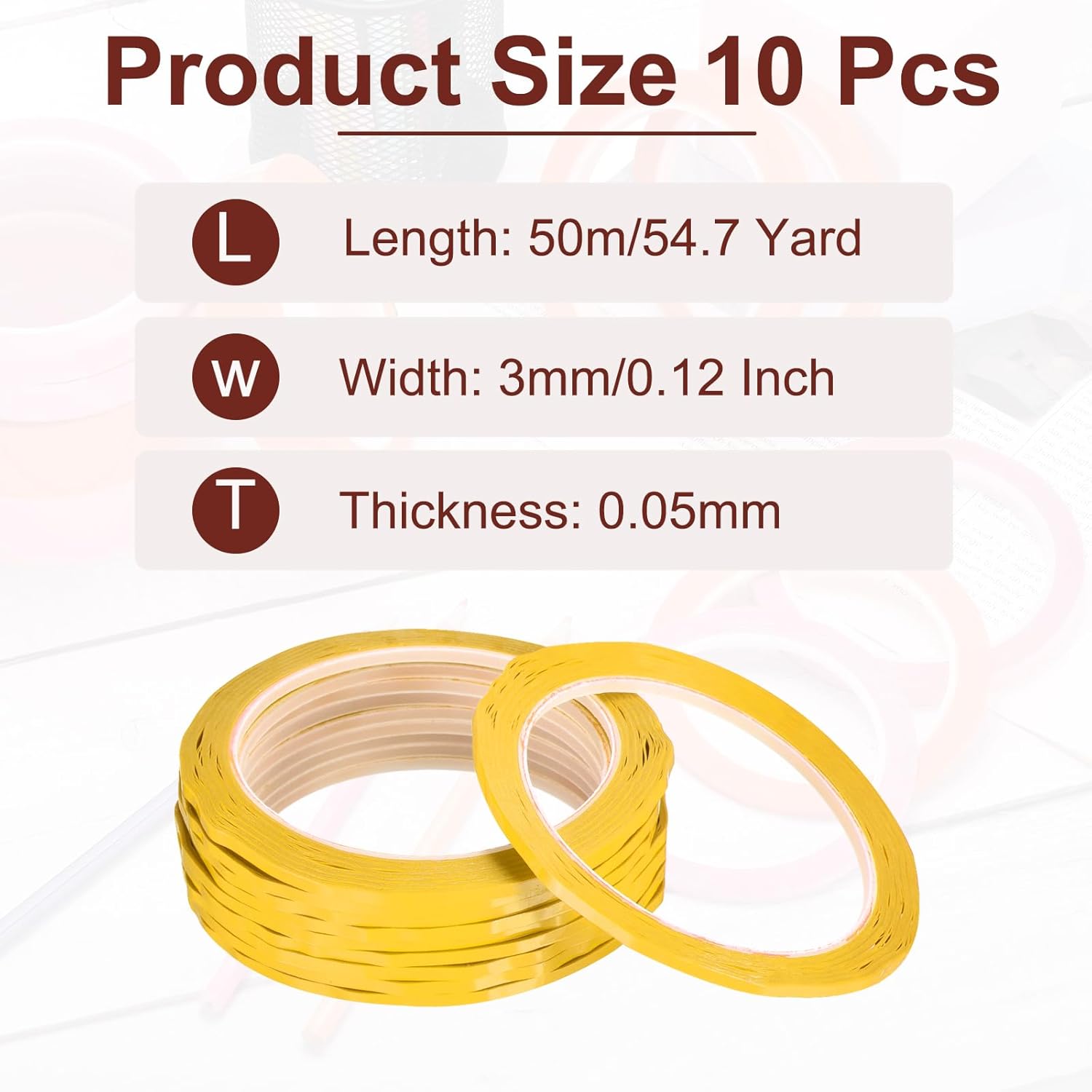 - This Art Tape is in size of: Length: 50m/54.7 Yard; Width: 3mm/0.12 Inch; Thickness: 0.05mm; Material: PET; Color: Yellow; Temperature Resistance: 100Β°C; In the Package of: 10 x Whiteboard tapes