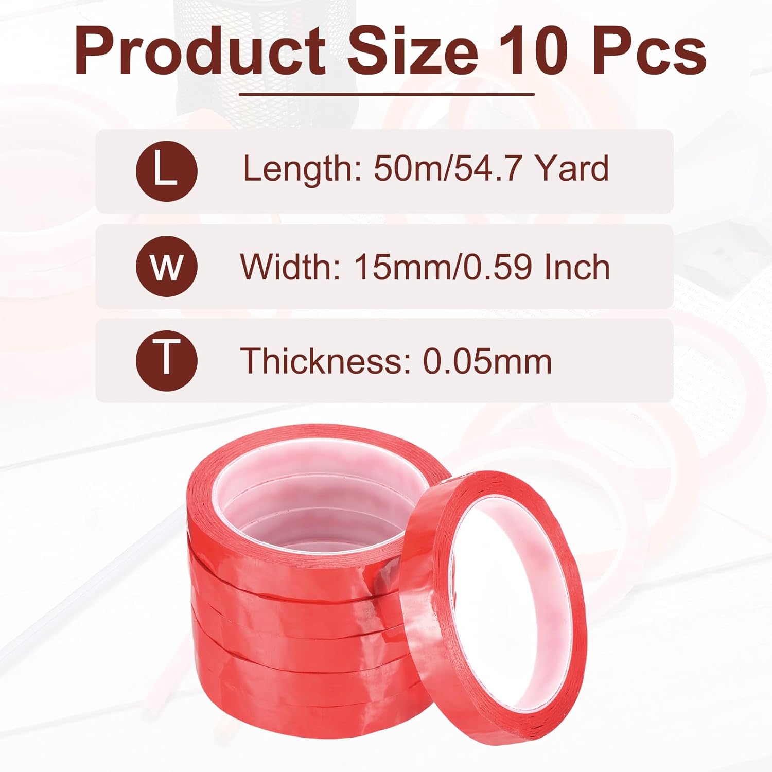 - This Art Tape is in size of: Length: 50m/54.7 Yard; Width: 15mm/0.59 Inch; Thickness: 0.05mm; Material: PET; Color: Red; Temperature Resistance: 100Β°C; In the Package of: 10 x Whiteboard tapes