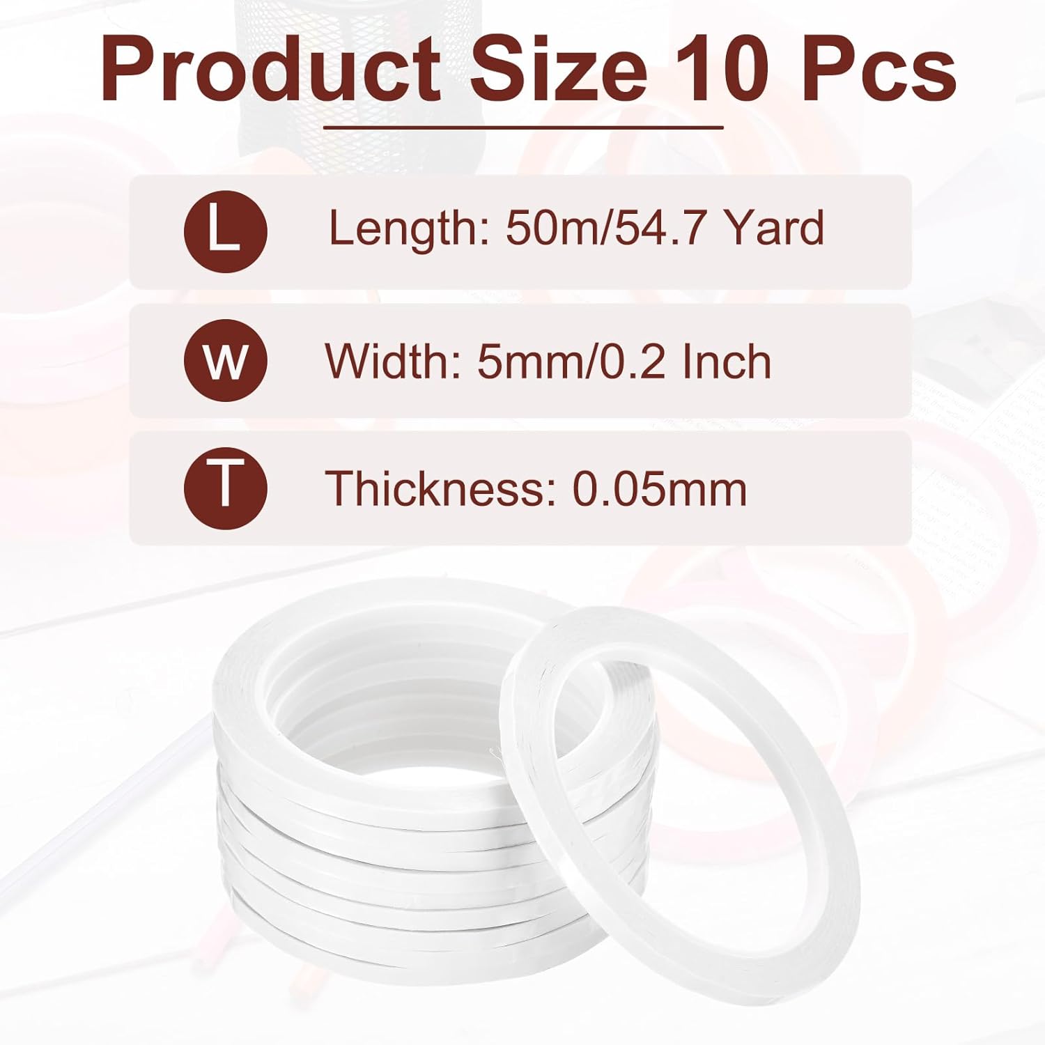 - This Art Tape is in size of: Length: 50m/54.7 Yard; Width: 5mm/0.2 Inch; Thickness: 0.05mm; Material: PET; Color: White; Temperature Resistance: 100Β°C; In the Package of: 10 x Whiteboard tapes