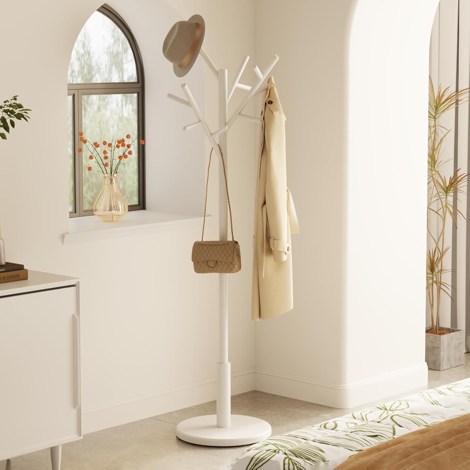 Coat Rack, Solid Wood Coat Rack Freestanding with 12 Hooks, Coat tree freestanding 3 Adjustable Heights for coat, Hats, Handbags,Coat Stand for Entryway,Bedroom (White)