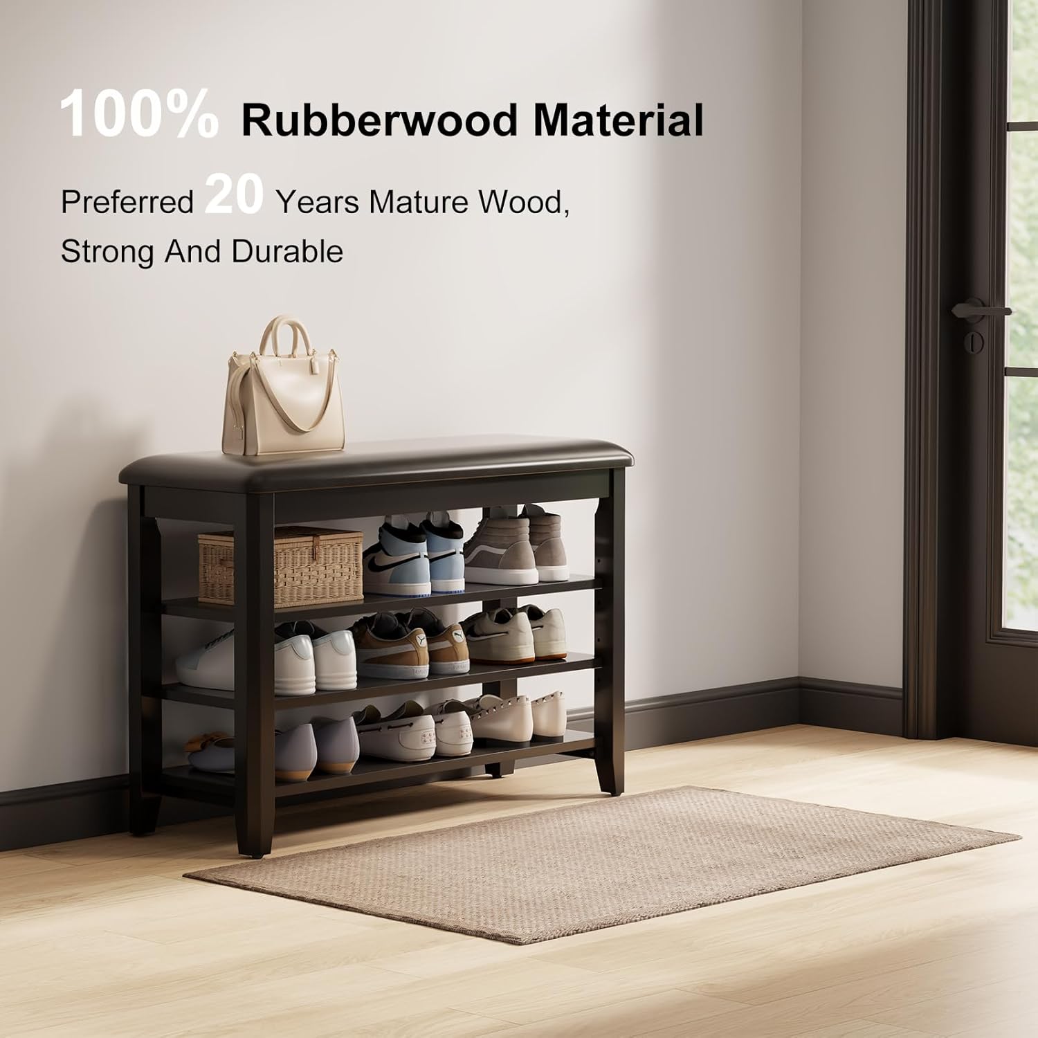 Shoe Bench with Leather Cushion, 3 Tiers Shoe Storage Bench Height Adjustable, Walnut Wood Entryway Bench for Hallway, Mudroom