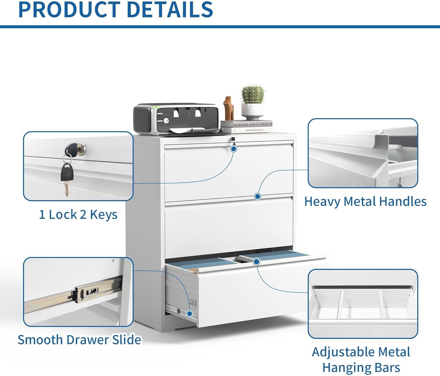 - 【Anti-tilt System】: This 3 drawer lateral file cabinet with lock meet your needs. It has has a anti-tilt design, ensuring that only one drawer can be open at a time. By preventing multiple drawers from being open simultaneously, the office cabinet maintains stability and greatly reduces the risk of tipping. You can have peace of mind knowing that your documents and equipment are secure.
