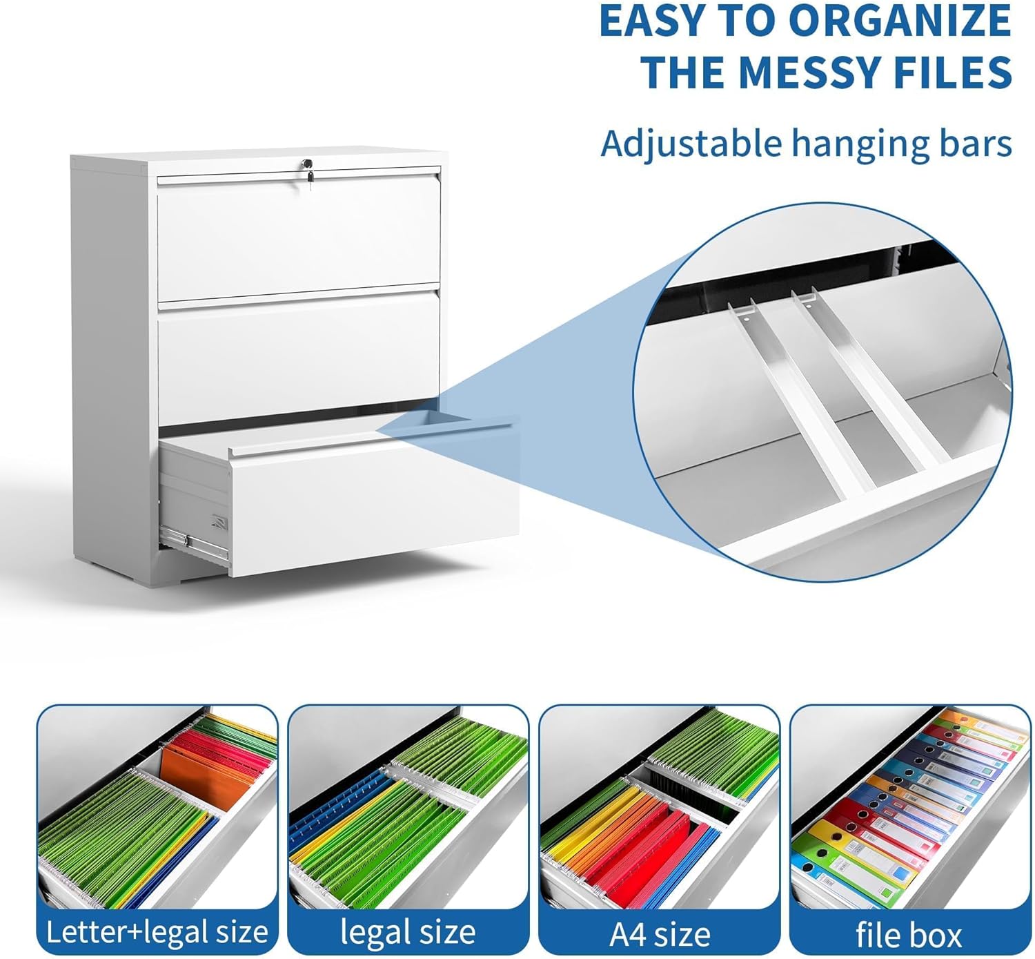 - 【Large Storage Capacity】: The office file cabinets have large capacity drawers that can hold legal, letter, A4; file box and F4 size hanging folders, this metal file cabinet is perfect for organizing your files and documents. The adjustable hanging bars allow you to customize the drawers to your specific needs, ensuring that everything stays in place and within easy reach.