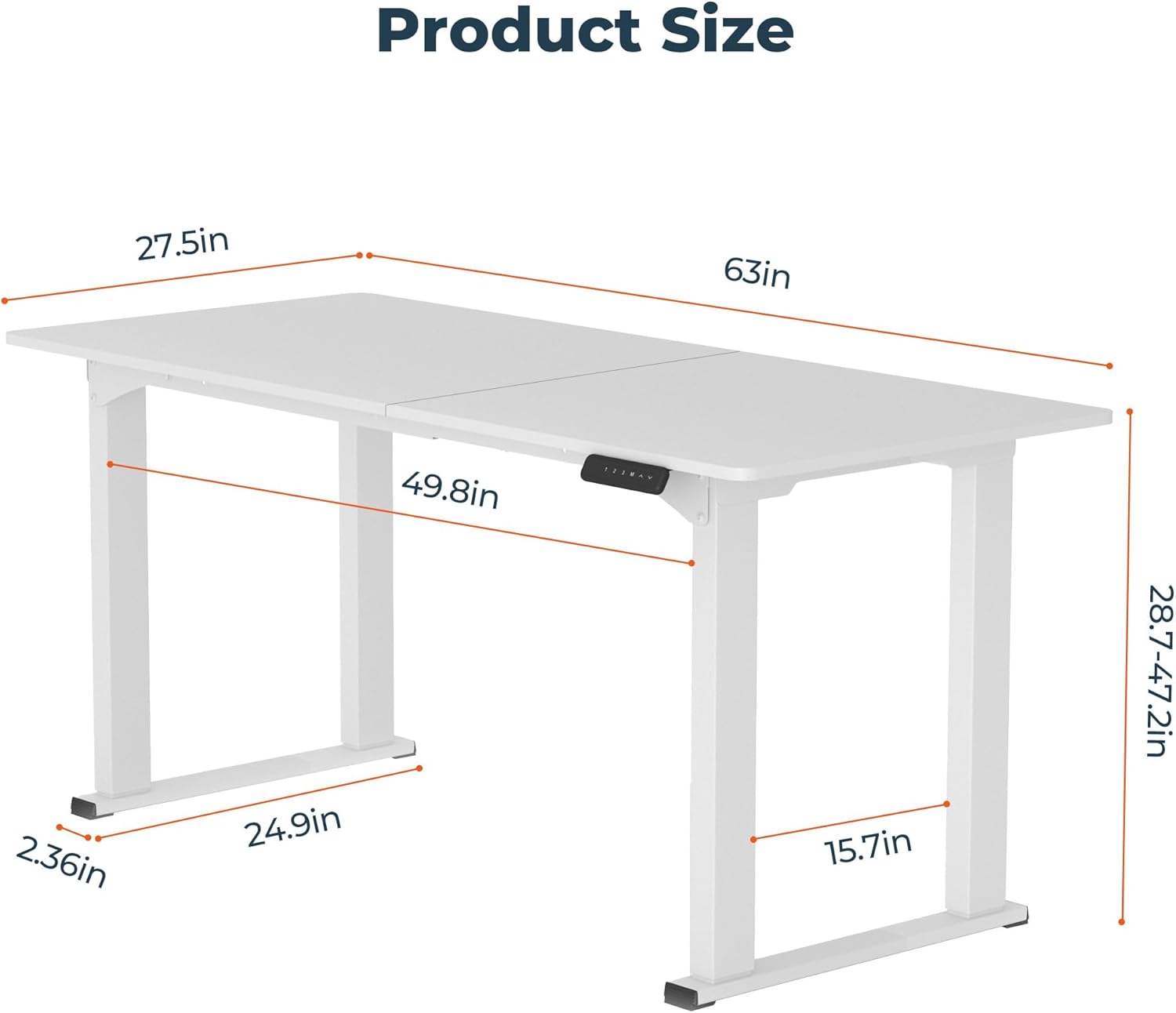 4 Legs Standing Desk, Large 63x28 Inches Electric Adjustable Height Desk with Splice Board, Stand Up Desks Home Office Computer Workstation, White
