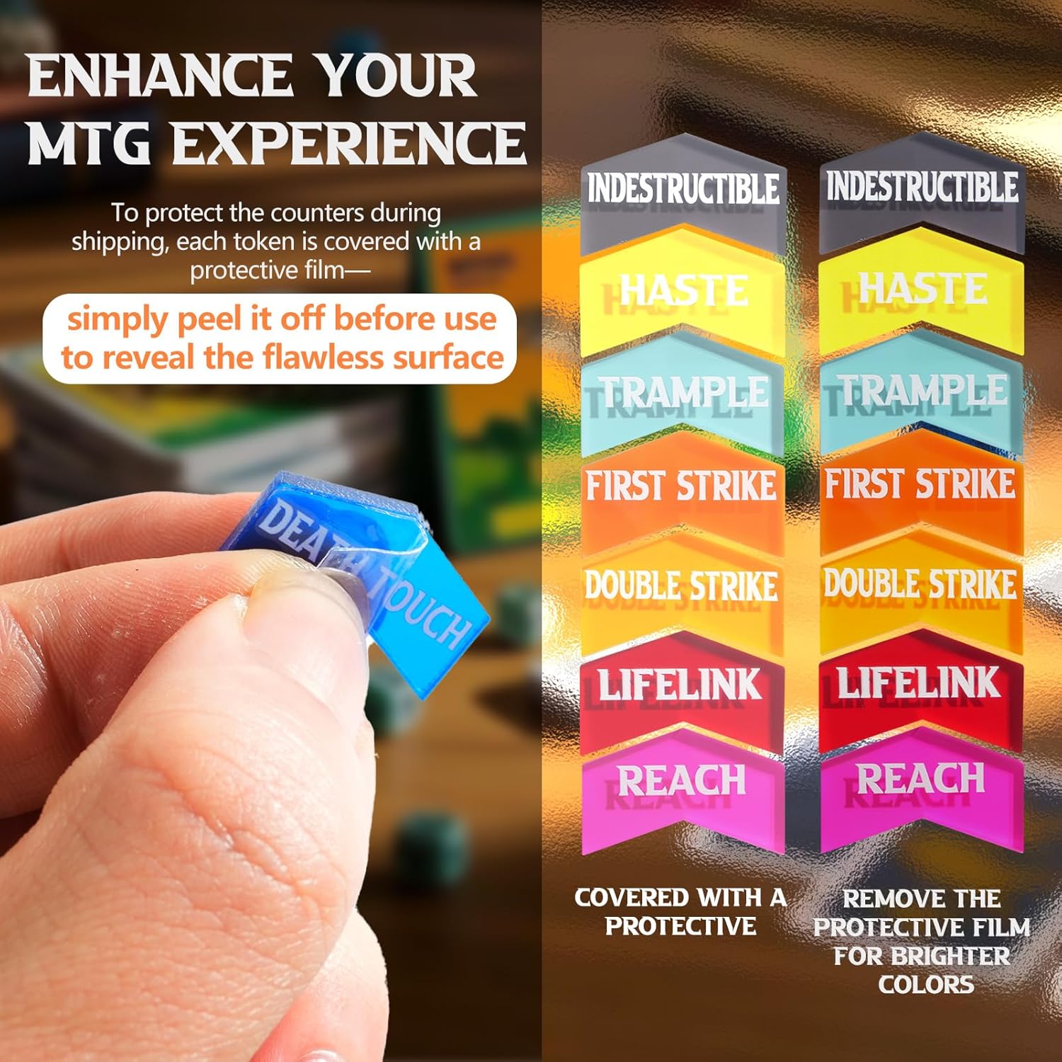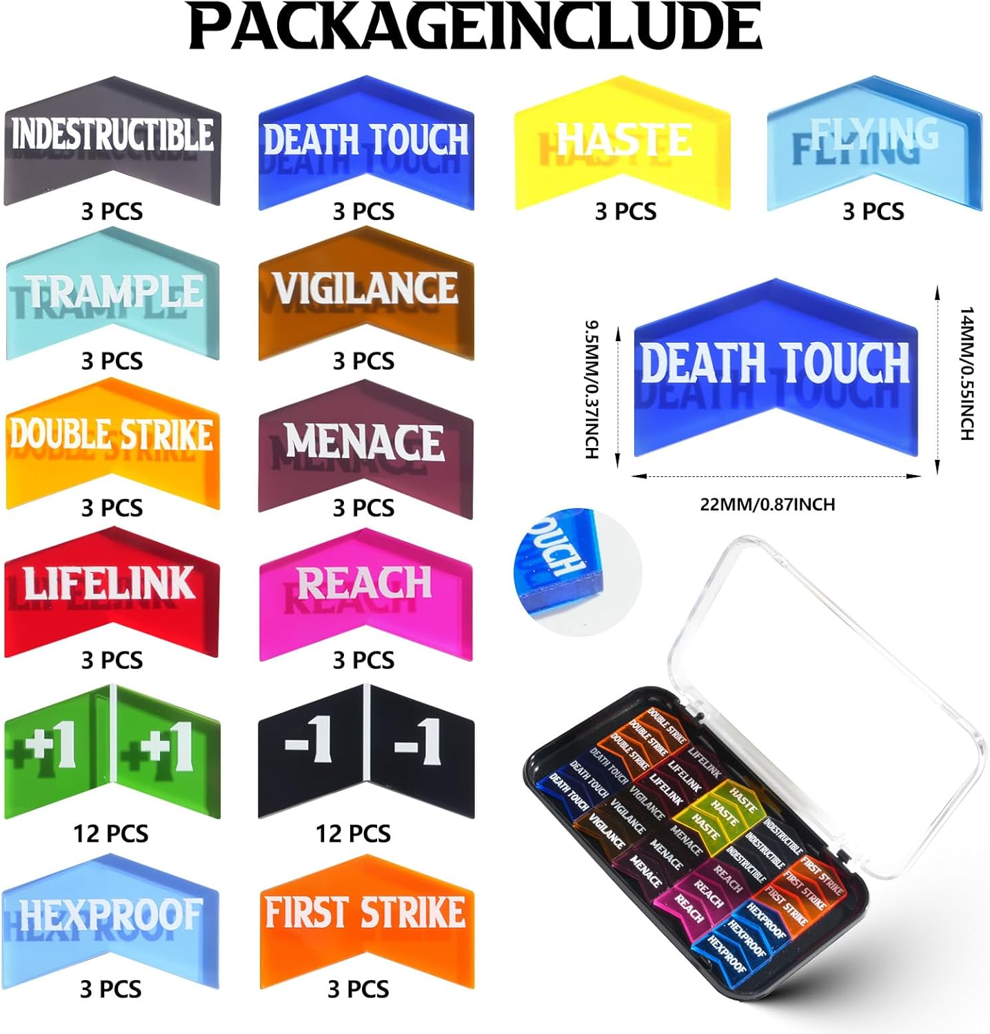 - Package Include: Total 60PCS MTG Colored Tokens, Includes 12 different keyword with 3 MTG tokens each, (FIRST STRIKE,VIGILANCE,MENACE,TRAMPLE,HASTE,DOUBLE STRIKE, LIFELINK,REACH,FLYING,HEXPROOF,DEATHTOUCH, INDESTRUCTIBLE),and 24pcs counters(12 pieces -1/-1counters & 12 pieces +1/+1 counters) with box