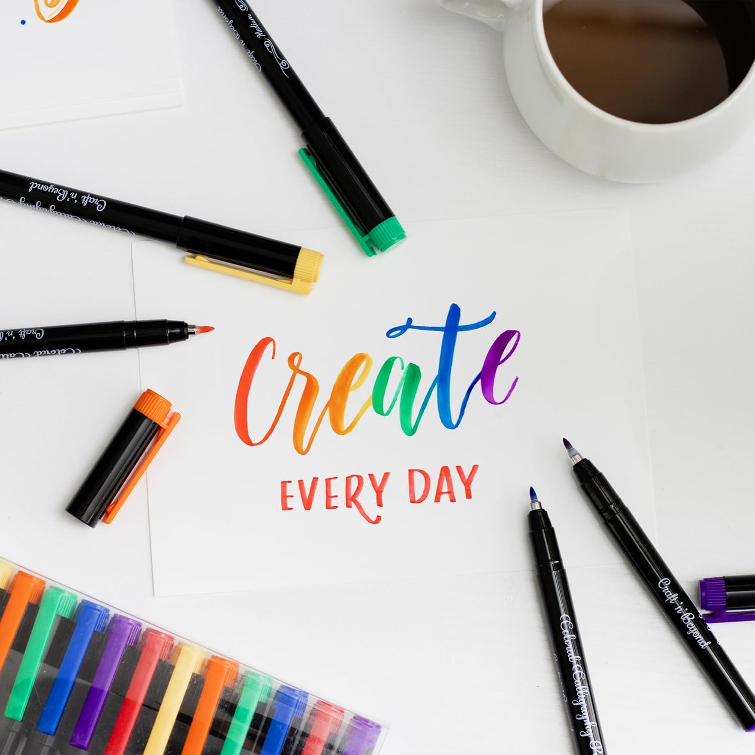 Craft 'n' Beyond Colored Calligraphy Brush Pens Waterproof Pack of 12 Markers for Hand Lettering, Art Drawing, Sketching, Scrapbooking, Journaling - Beginner Kit with Fadeproof Ink