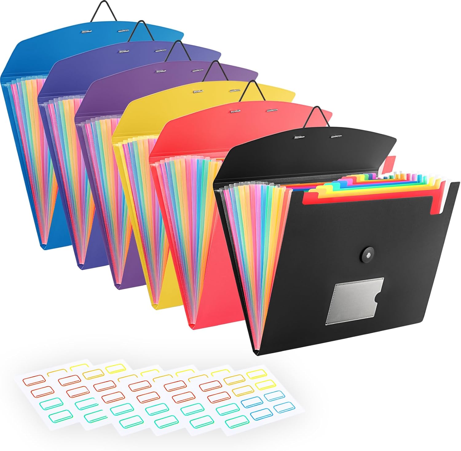 - Extra Capacity: 6 Pack 13-pocket accordion folders (black, blue, blue purple, purple, yellow, pink), each measuring 13 x 9.6 inches. Each folder holds up to 300-360 sheets of paper. It also comes with 6 x 12 writable labels for easy organization and quick access