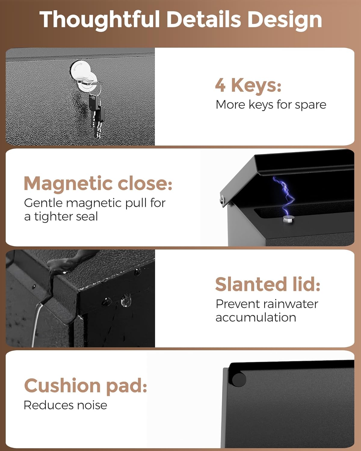 - [Thoughtful Details]: Our mailbox provide you with four keys, no need to worry about keys lost or not enough; the lid is equipped with a black pad, which can be opened and closed quietly; the magnet can make the lid close more tightly through magnetic force, always keeping the contents in the box dry and intact