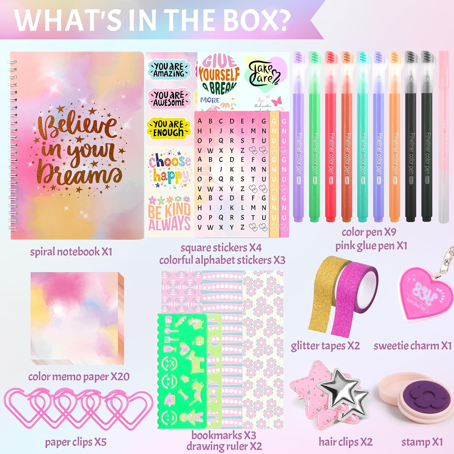 - Creative Arts & Crafts Kit: Includes a variety of fun and cute art supplies, such as colorful pens, stickers, and stencils. Itβs perfect for girls who enjoy crafts, journaling, and scrapbooking