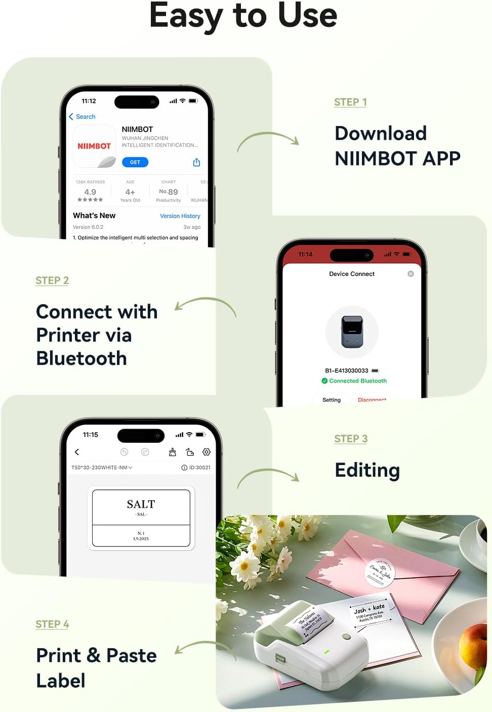 - Easy to Use: The NIIMBOT B1 Bluetooth label maker uses direct thermal printing, so there’s no need for ink or toner. It’s compatible with iOS and Android smartphones but not iPads. To use it, first install the NIIMBOT app from the Apple Store or Google Play, then connect via Bluetooth. For PC connection via USB, you’ll need to download the driver from NIIMBOT’s official website.