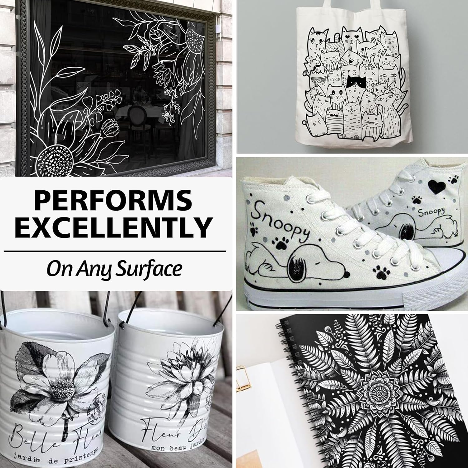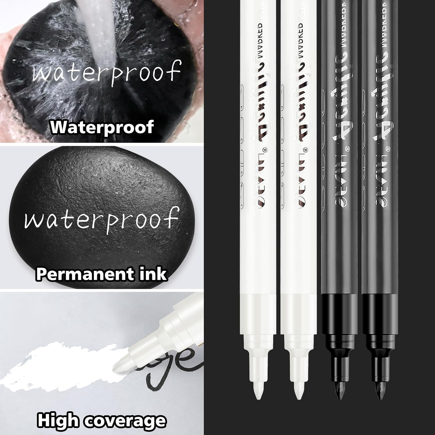 - VERSATILE ARTISTRY & CRAFTS - Perfect for DIY enthusiasts and professionals alike! These acrylic paint markers effortlessly write on virtually any surface: rock painting, ceramics, glass, wood, plastic, canvas, and more. Unleash your creativity on both light and dark backgrounds with the included opaque white and bold black inks.