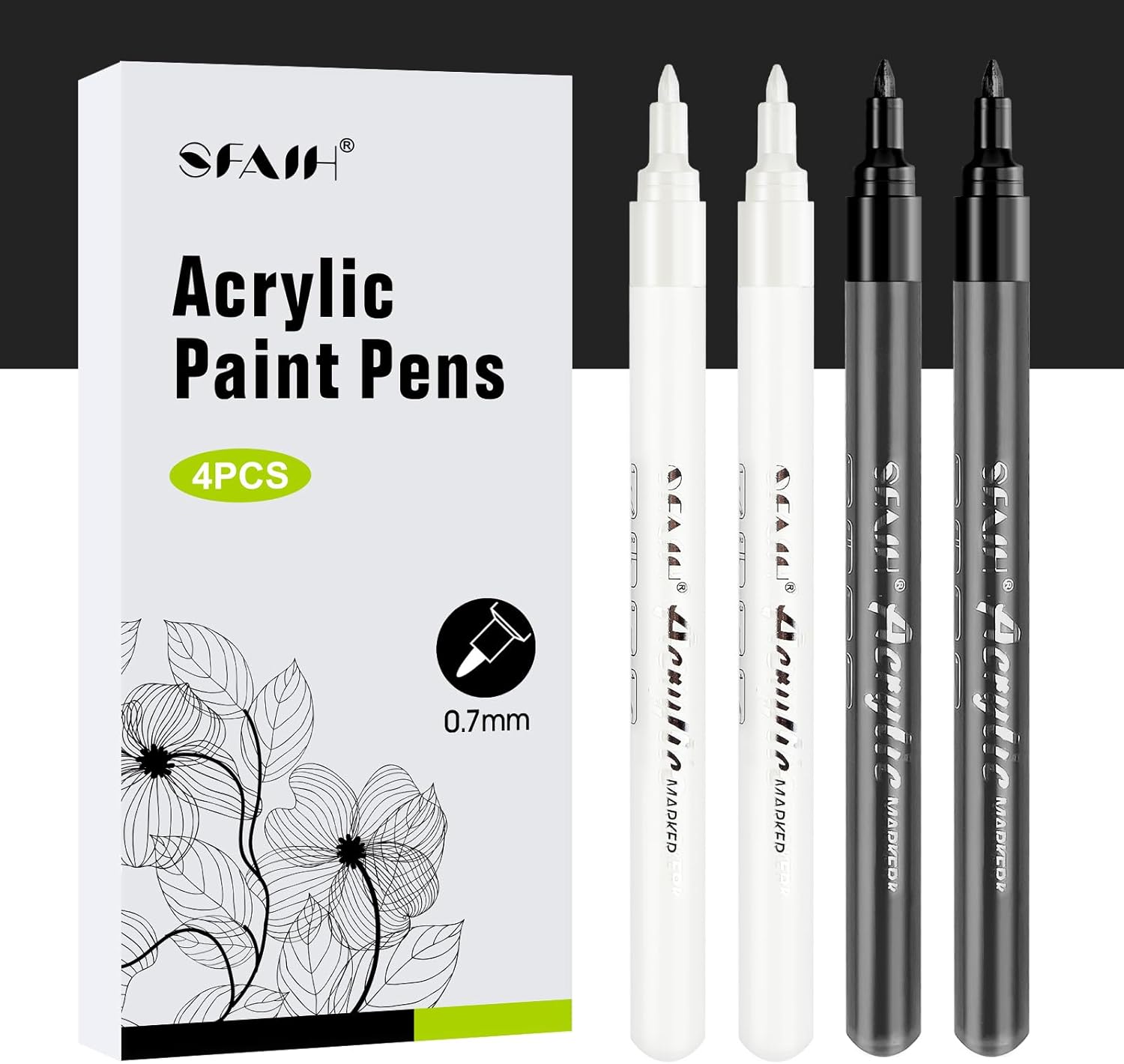 SFAIH White & Black Paint Markers Pens - 4 Pack 0.7MM Fine Tip Acrylic Markers for Rock Painting, Wood, Metal, Fabric, Plastic, Canvas, Glass, Ceramic, Diy Crafts, Drawing, Tire