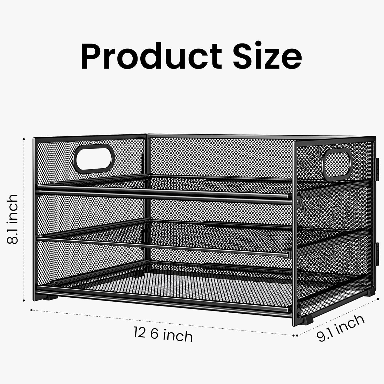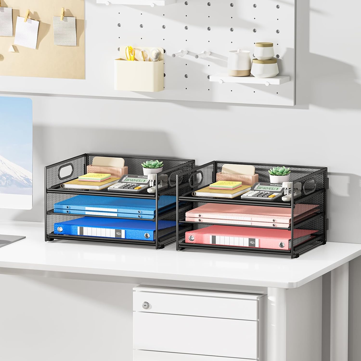 Subekyu 2-Pack 3-Tier Paper Letter Tray Organizer for Desk, Black Metal Mesh File Sorter Organizer with Handle and 1 PC Sliding Tray for Home Office School Desk Supplies Organization Storage