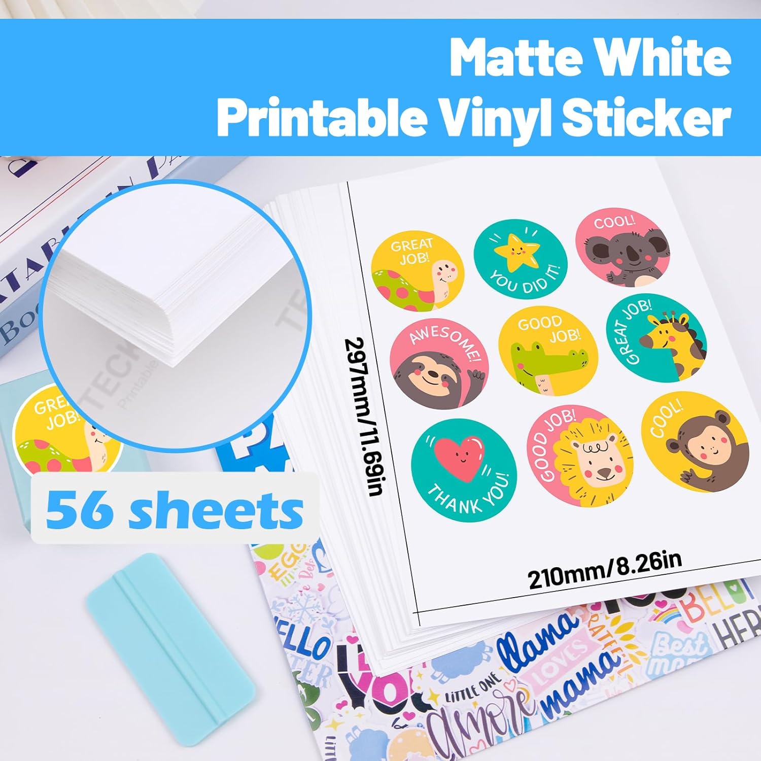 TECKWRAP Printable Vinyl Sticker Paper for Inkjet Printer, Matte Inkjet Printable Vinyl, 8.26" x 11.69" A4 56 Sheets/Pack Photo Paper for Craft Scrap-Booking, Stickers, Labels