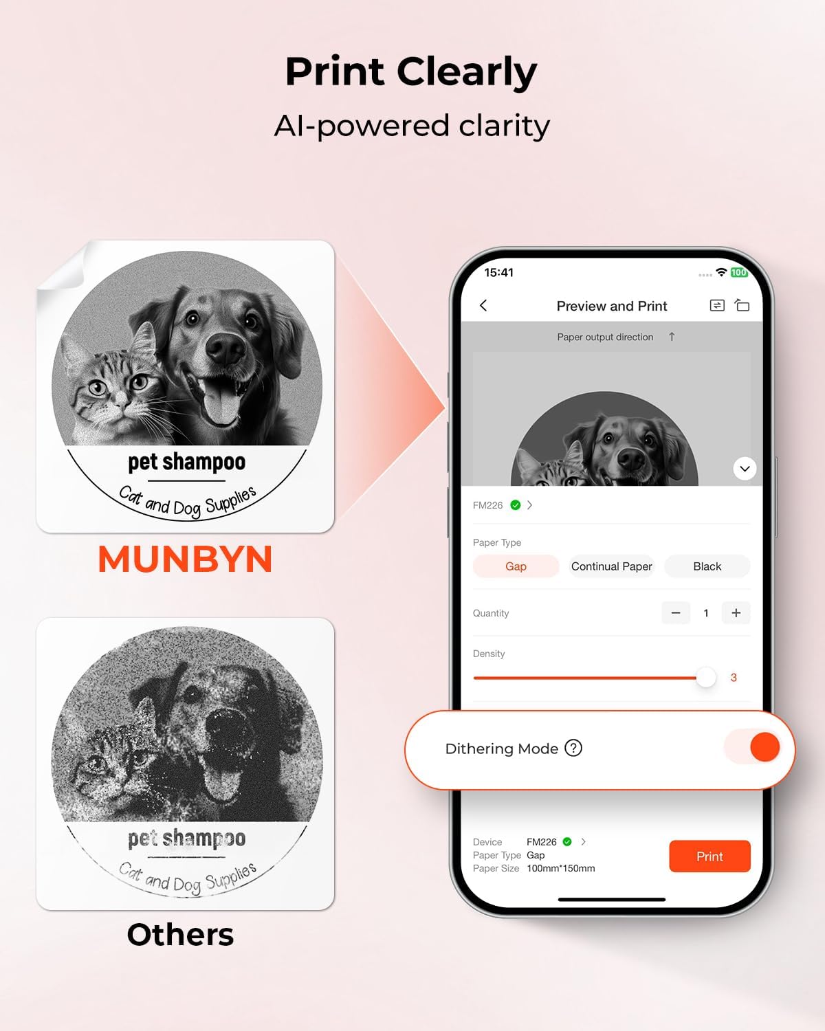 - [High-Definition Printing, Detailed Presentation] The MUNBYN FM226 label printer supports 203 DPI high-definition inkless printing for sharper images and richer details, eliminating the harsh texture of traditional label printers. (Includes 220 sheets of 50x30mm label paper, ready for inspection and use right out of the box.)