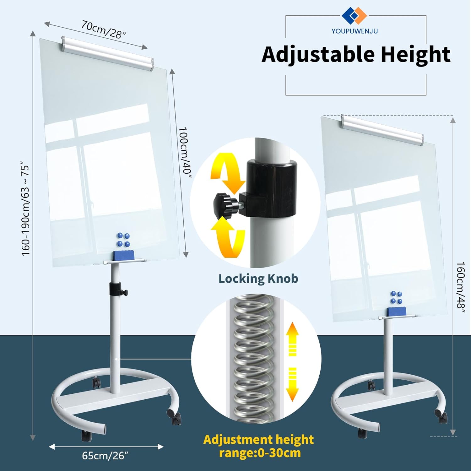 Rolling Writeboard Premium Tempered Magnetic Glass Whiteboard 40"x28" Rolling Dry Erase Board with Tempered Glass Surface Adjustable Height Multi-Use Standing (White)