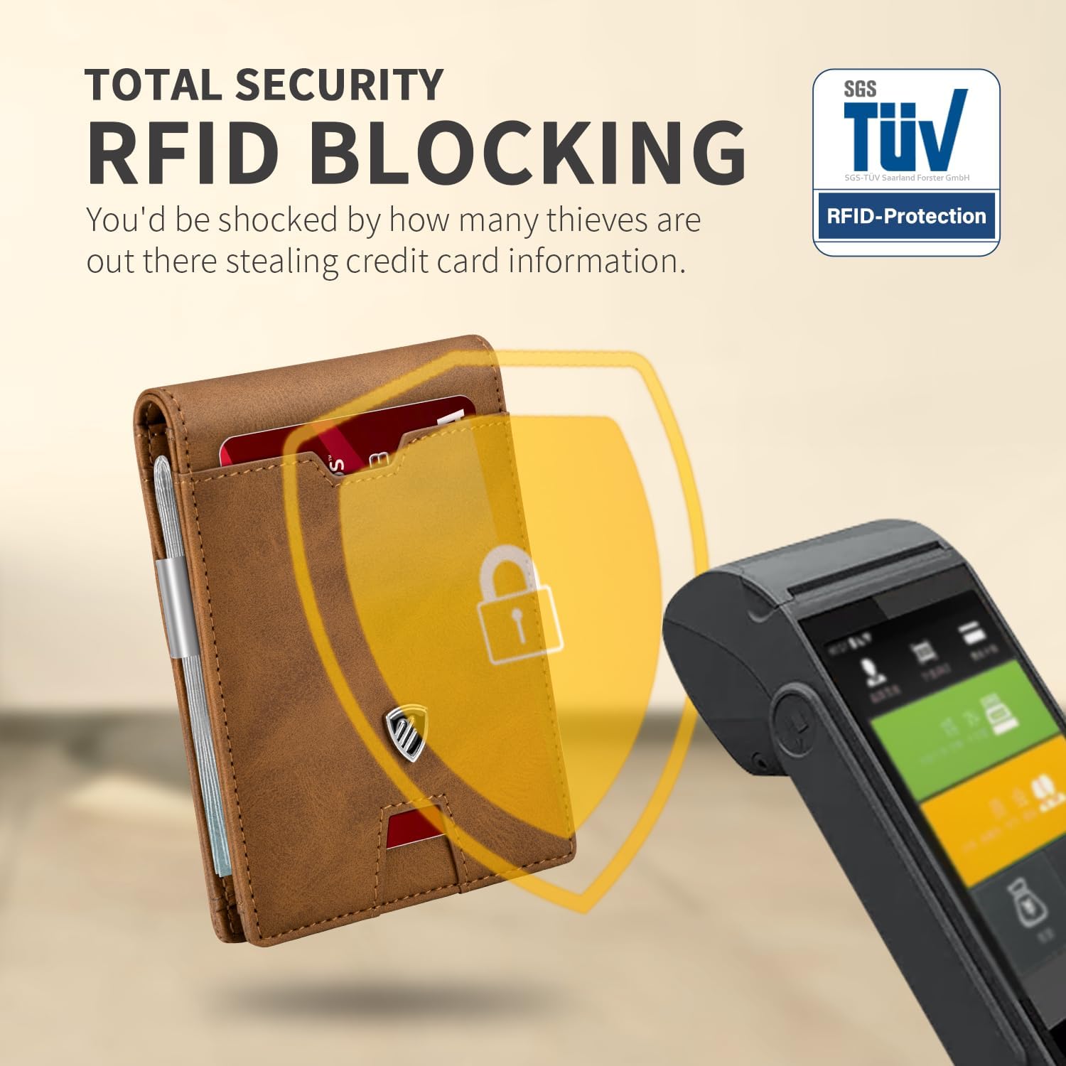 - RFID Blocking Protection - This rfid wallet for men is tested by an independent German quality control institute, specifically to block 13.56 MHz or higher RFID signals and protect against data theft by RFID scanners