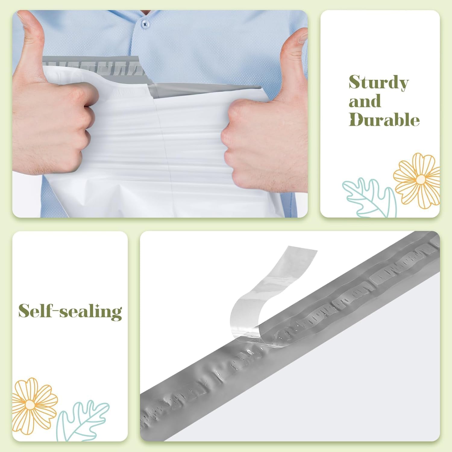 - Strong Adhesive Self Sealing Mailers-Each large mailing envelope contains a strong adhesive self-sealing strip.The strong stickness prevents your items from being secretly replaced during transportation.Simply peel and fold over to seal each package safely and securely.