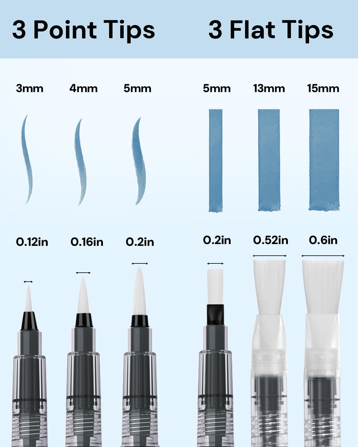 - 【Dual-Tip Water Brush Pens for Every Art Need】Portable watercolor brush pen set with 3 sizes (S/M/L) of both pointed and flat tips. The fine tips create precise lines for details, while the flat tips deliver bold strokes and smooth washes. Ideal for watercolor techniques, calligraphy, and mixed media applications