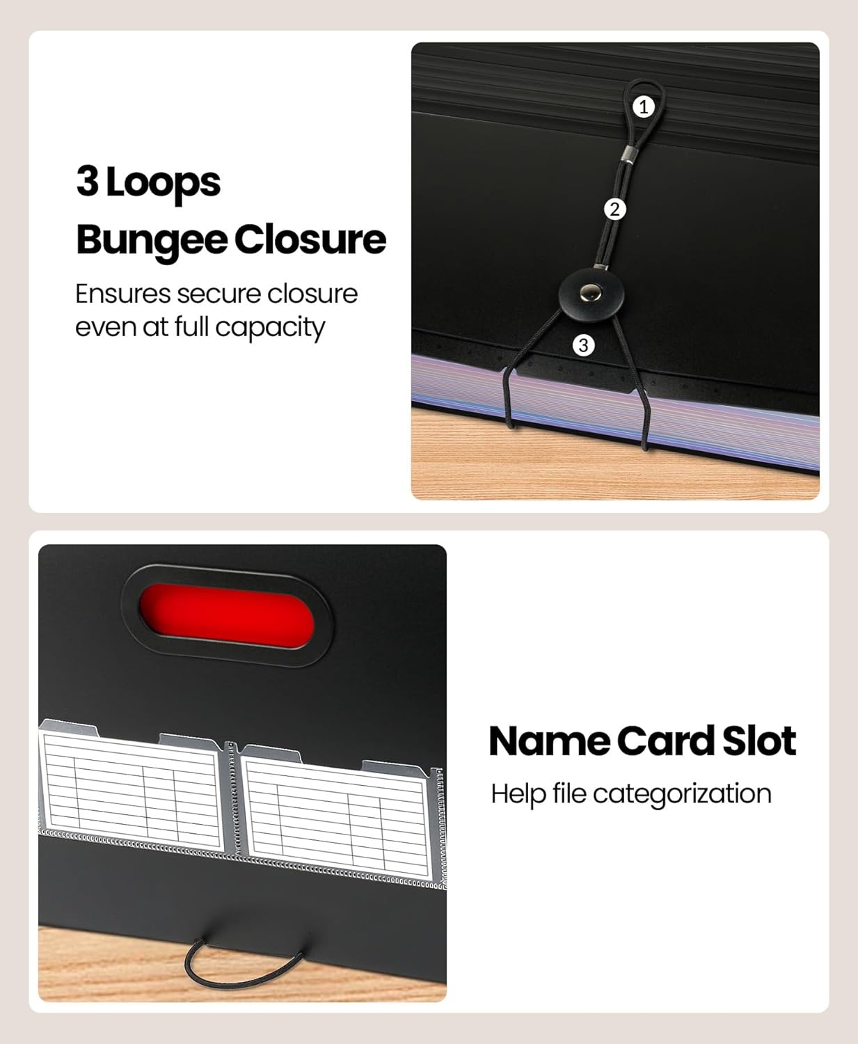 - Deeper Pockets & Unobstructed Tabs: In response to a common issue in accordion folders where papers cover index labels, we've increased pocket height by 0.8 inches (2 cm). This unique enhancement ensures your labels remain visibleβa feature unmatched by competitors