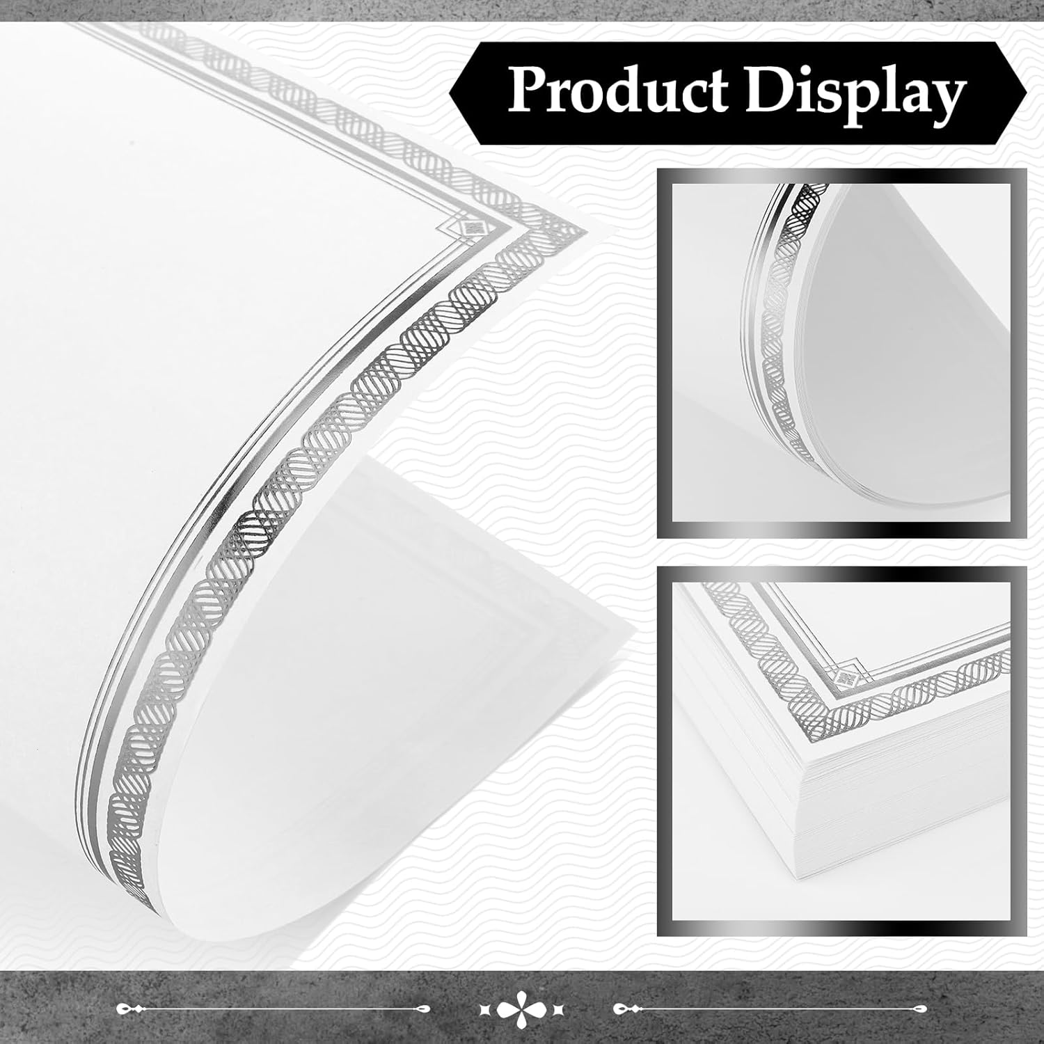 - Silver Foil Certificate Paper: this certificate paper is elegantly framed with an exquisite silver foil border, with a vintage paper effect, very suitable for small businesses, recognizing the employee of the month, student of the month, office achievements, and graduation ceremony