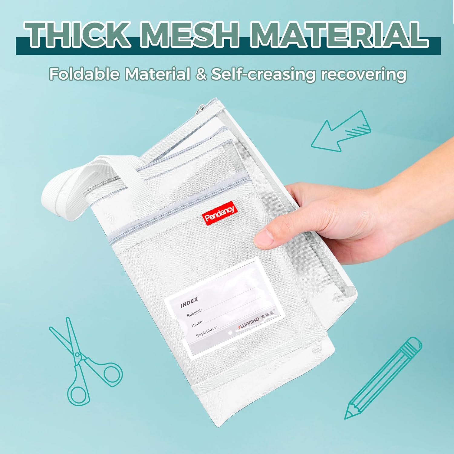 Pendancy Mesh Zipper Pouch A3 Size, Large Double Pocket Lightweight Nylon Transparent File Bag with Handle, 13x17 in Foldable Document Storage for Puzzle Project/Cross Stitch/Travel/Office (White)