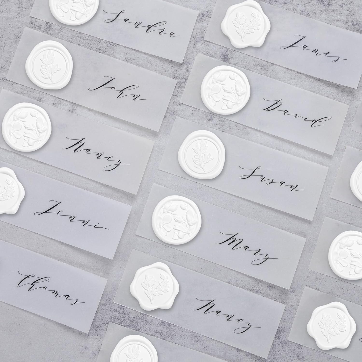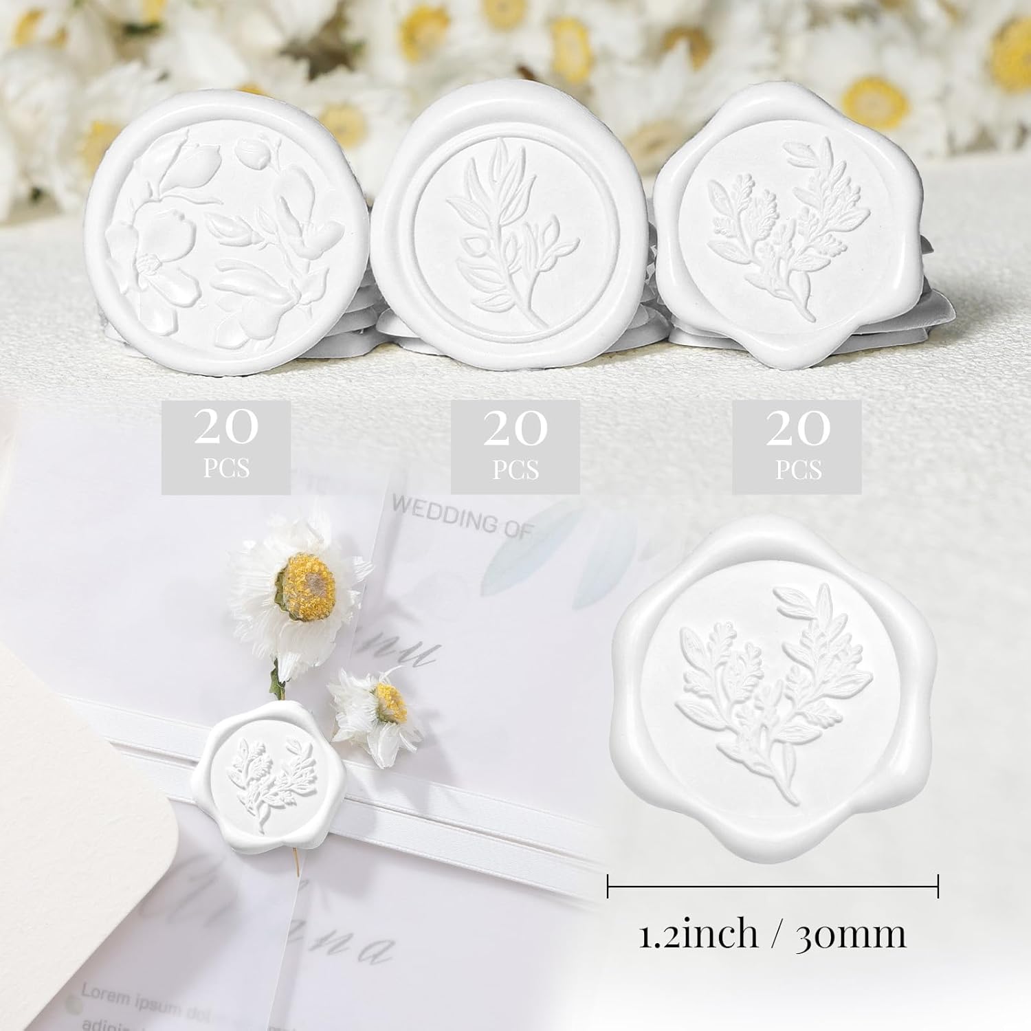 - PACKAGE INCLUDES - You will receive 60 pieces of snow white color wax seal stickers, (20 stickers per design) - Magnolia & Eucalyptus & Olive Branch. The wax seal sticker diameter is 1.2 inches/30mm and with almost the same size of adhesive on the back. Weighs 0.02oz per seal and may add weight to envelopes.