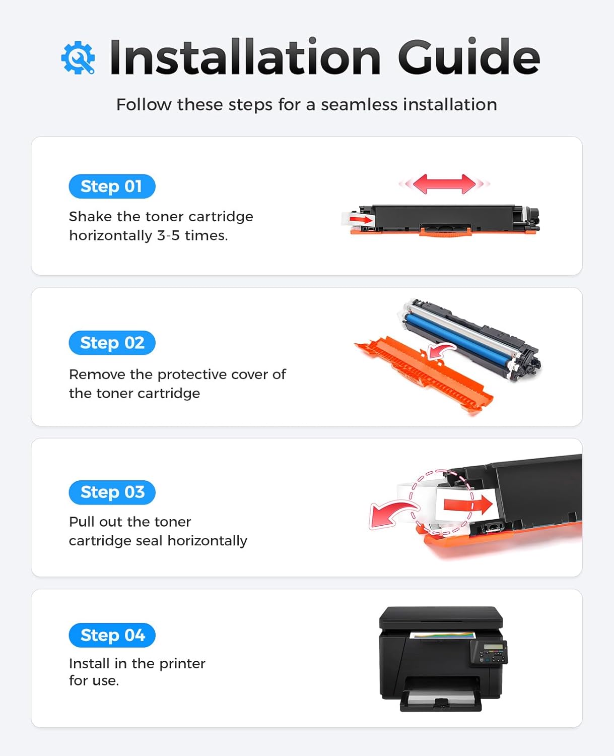 - Package Contents: Total 4 pack 130A CF350A toner cartridges +1x user manual, 1*Black / 1*Cyan / 1*Yellow / 1*Magenta (CF350A CF351A CF352A CF353A).