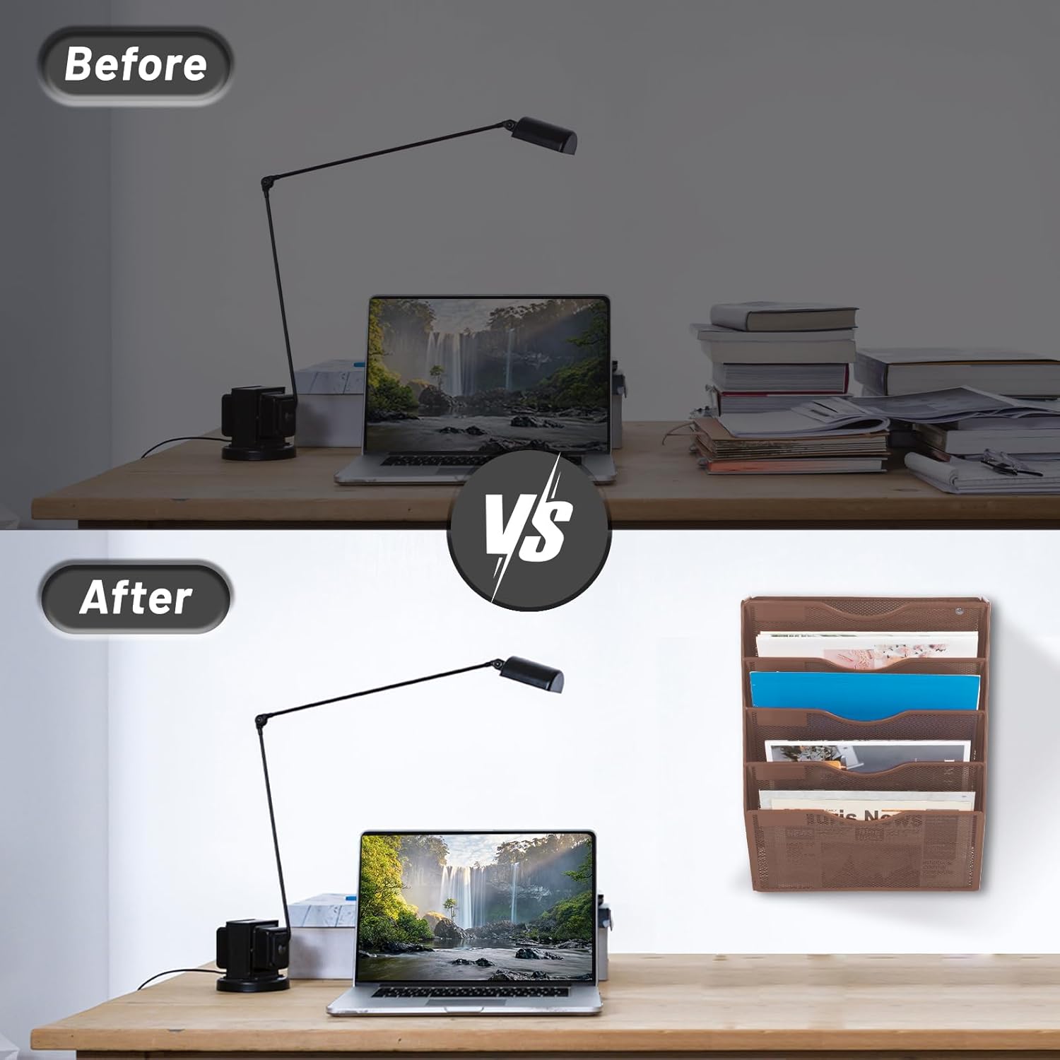 EASEPRES 5 Pocket Mesh Hanging Wall File Organizer, Wall Mounted Mail Paper Document Folder Holder, Clipboard Storage Organization Magazine Rack with Nametag Label for Office Home School, Brown