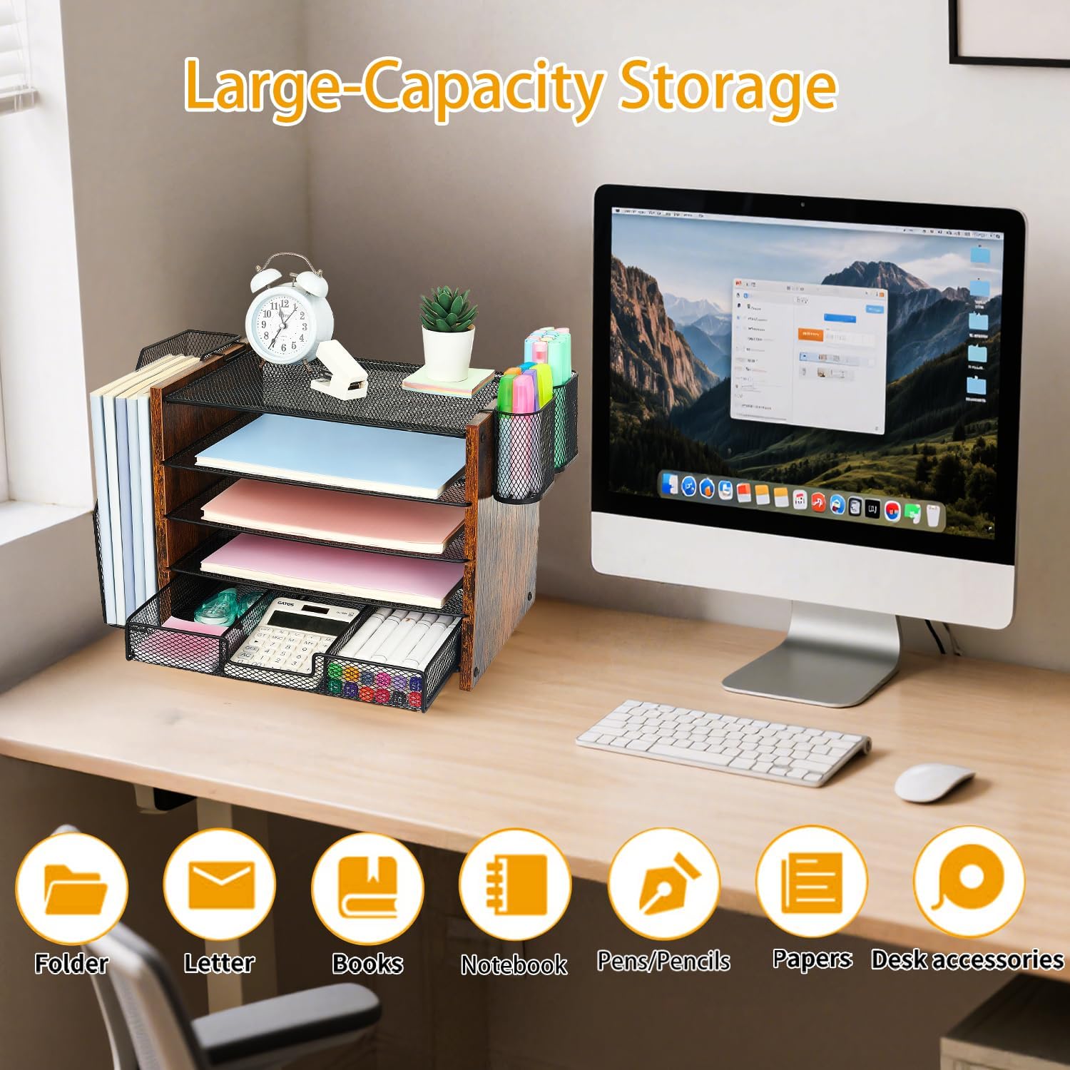 - 【Modern Decor Upgrade】Warm brown wood and matte black steel blend perfectly to create clean, flowing lines. This 5-tier paper tray organizer can enhance your workspace, making work more enjoyable, and is also an ideal gift
